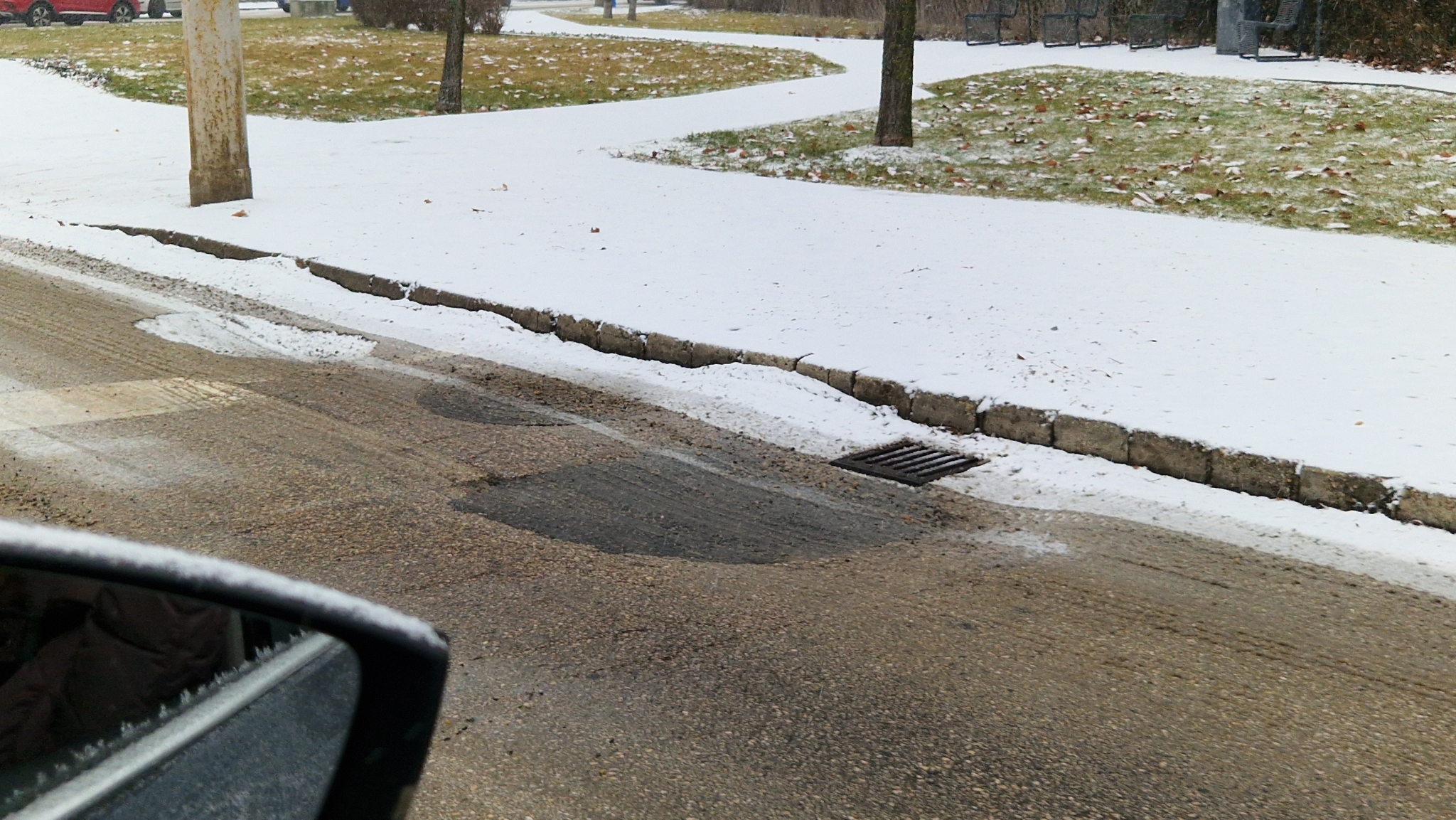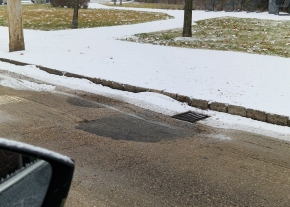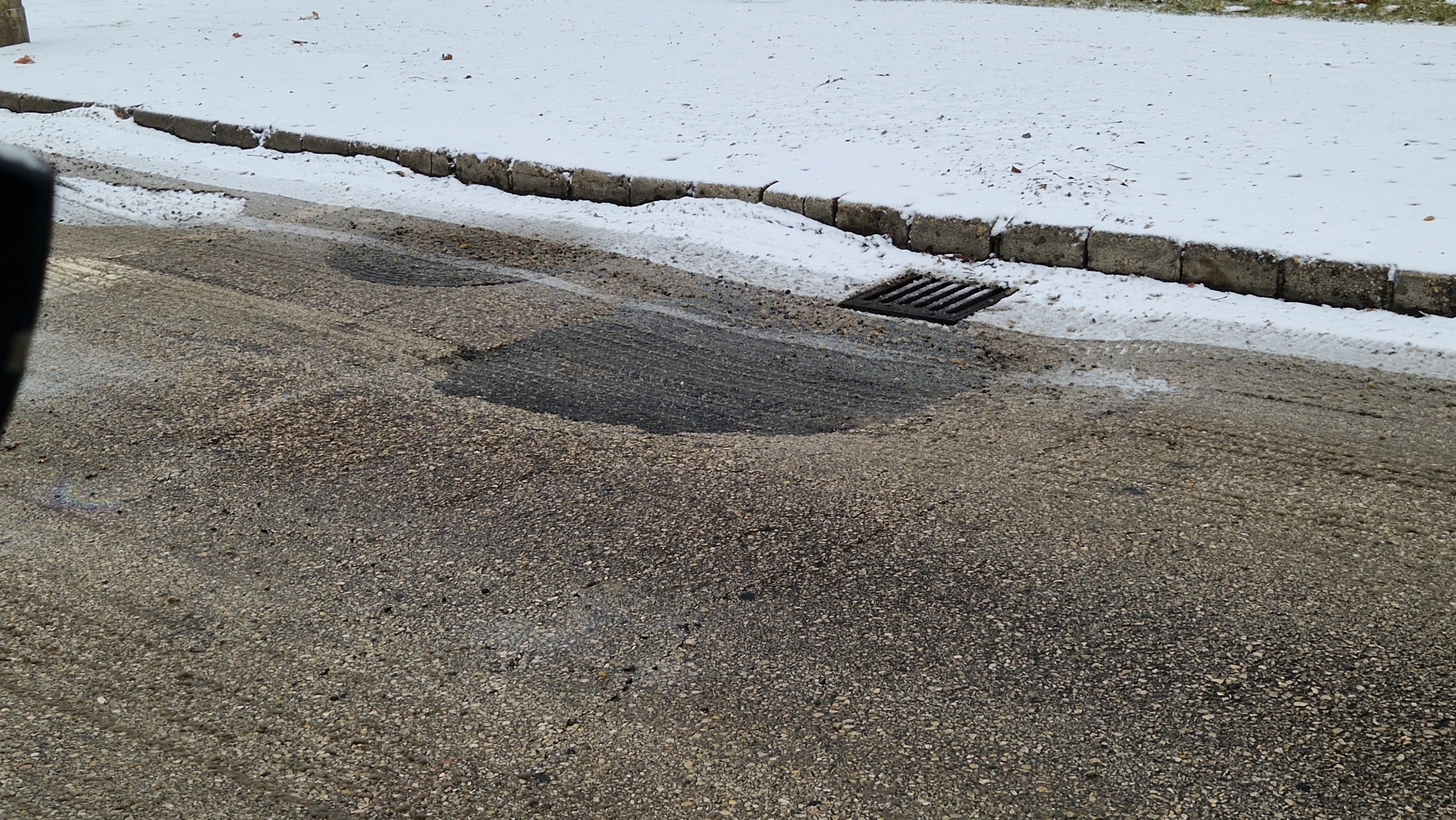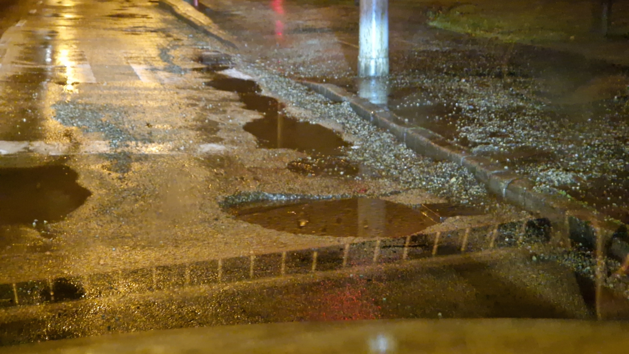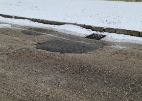 Út mentén annyira széles kátyú, hogy kikerülni nehézkes, mert át kell lógni a belső sávba. Sikeresen belezuhantam, ugyanis a tocsa miatt nem lehetett látni mekkora kiterjedésű. Jelzem: nagy