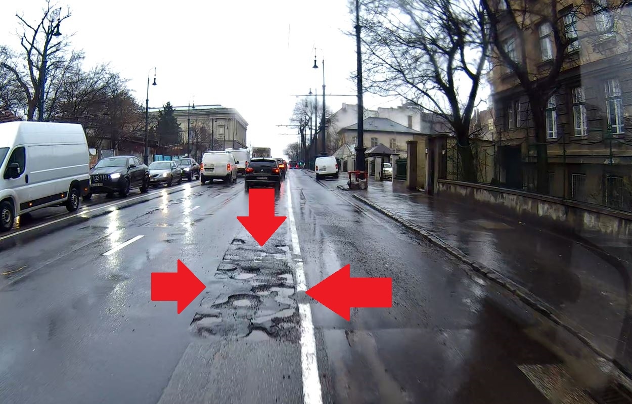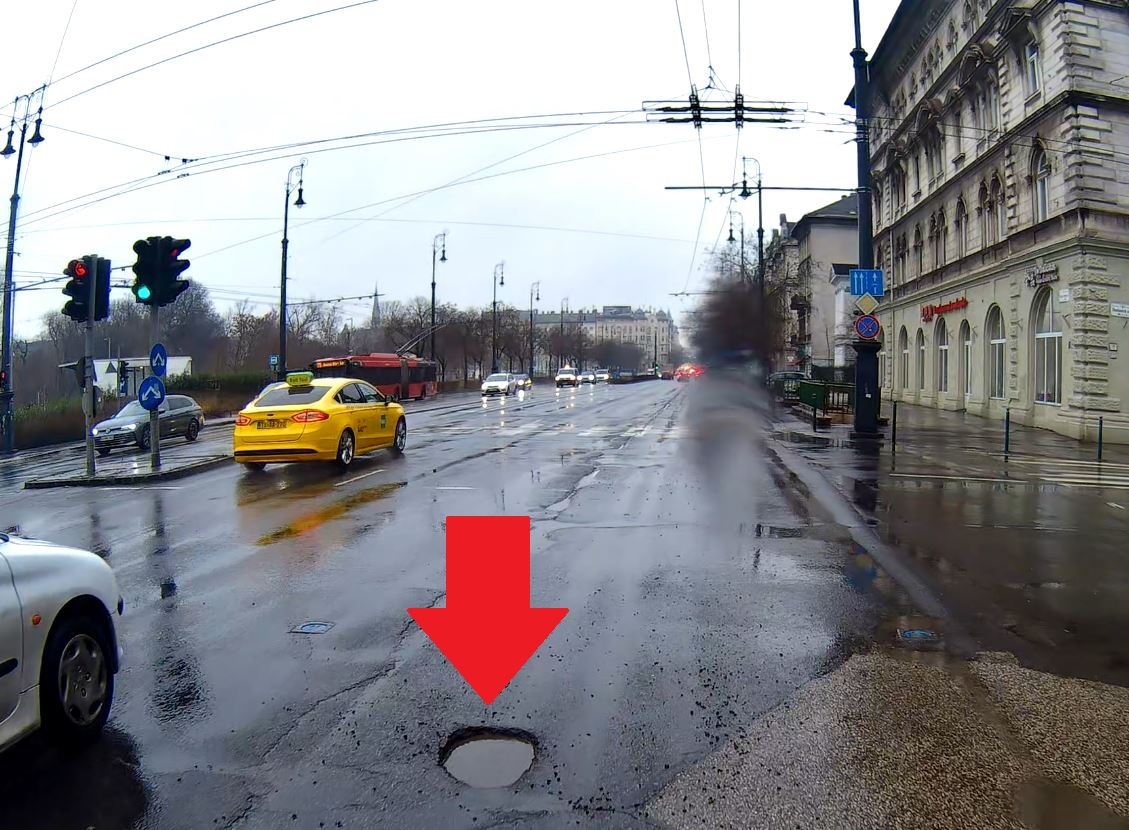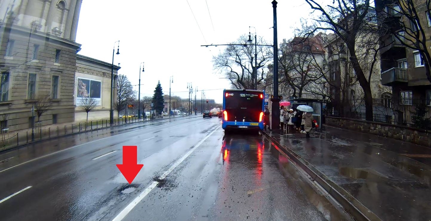 Belsőbb sávban is jeleztem kátyút, ahol gyakran kell behúzódnia a buszoknak beparkolás vagy más miatt.