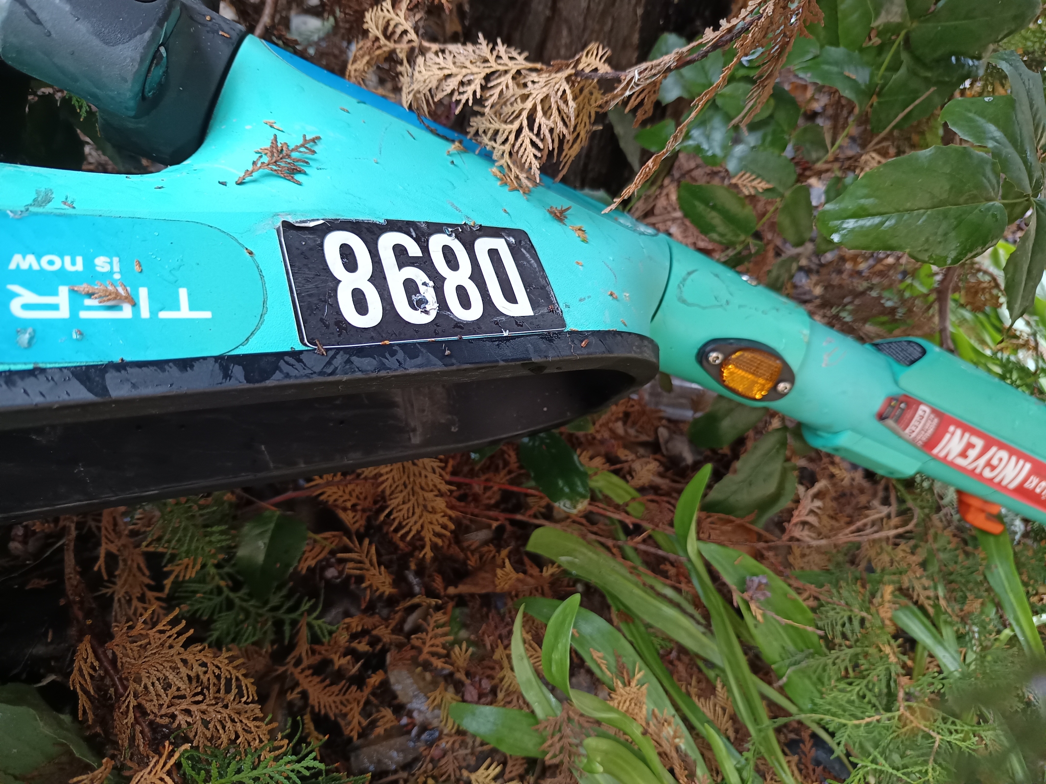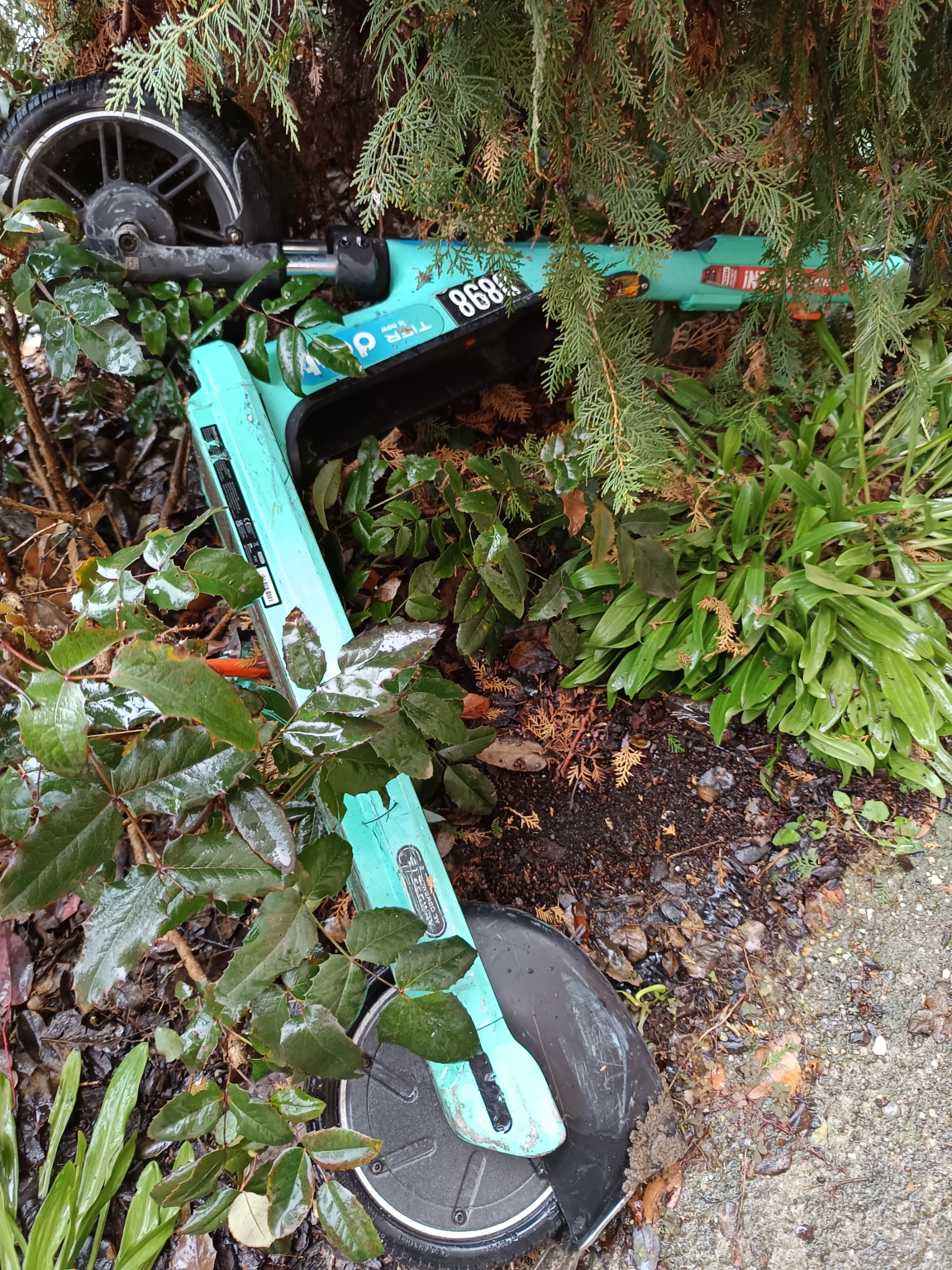 A Csombor U. 13. Sz. előtt a kertbe dobták egy e- rollert. Napok óta ott hever.