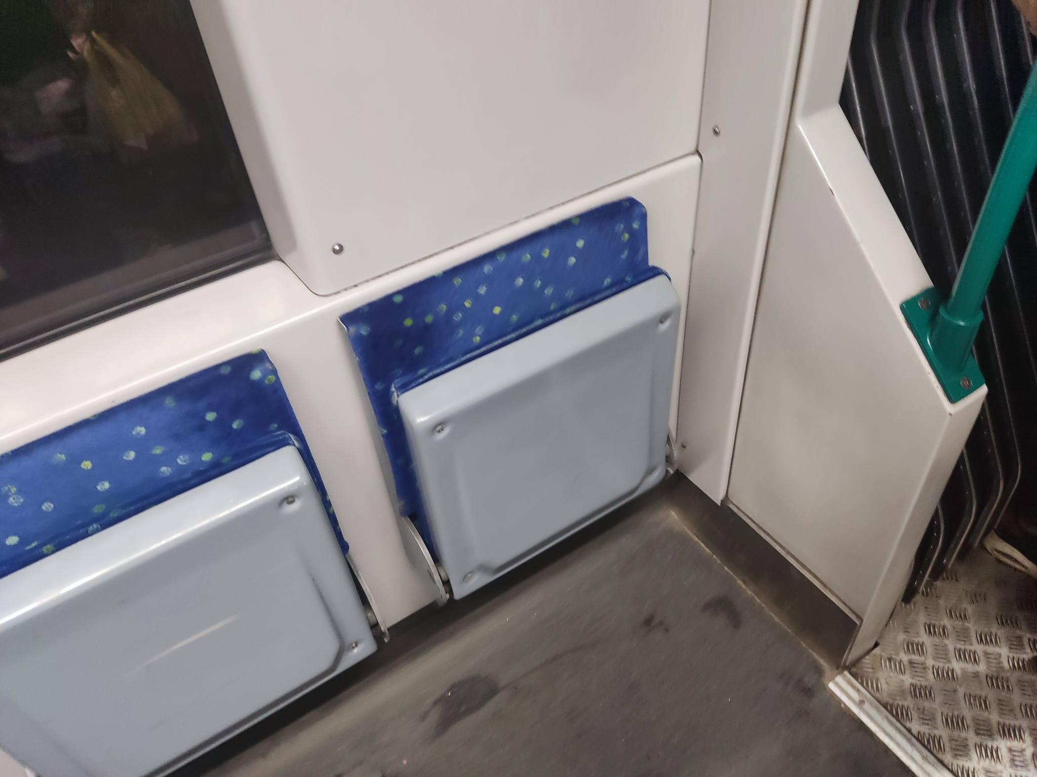 Kiálló fém drótok a 2010 Combinó villamos lehajtható ülésének sarkán a 7A ajtóhoz legközelebb. Ruhát harisnyát tönkretett.