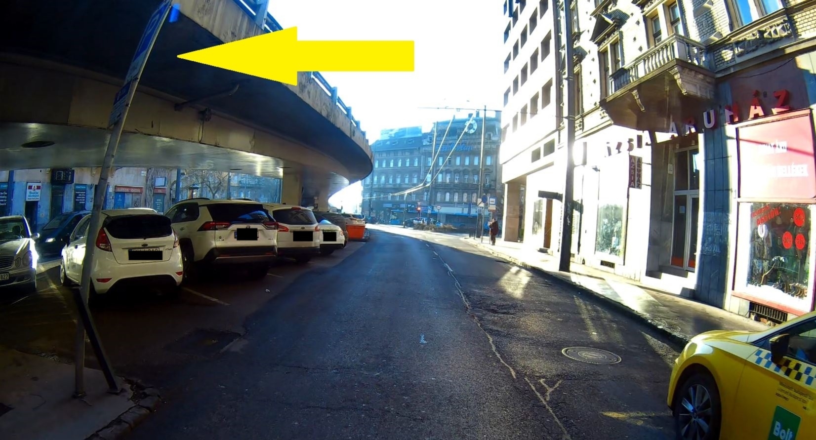 Fiumei úti felüljáró alatt ügyeskedünk a csúcsforgalomban, bal tükreinket féltve.