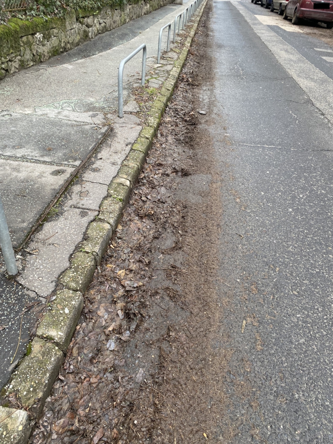 A Tárogató út elején az úttest széle nincs takarítva, vastag rétegben felhalmozódott, rothadó falevelek borítják. Kérem végezzék el a takarítást.