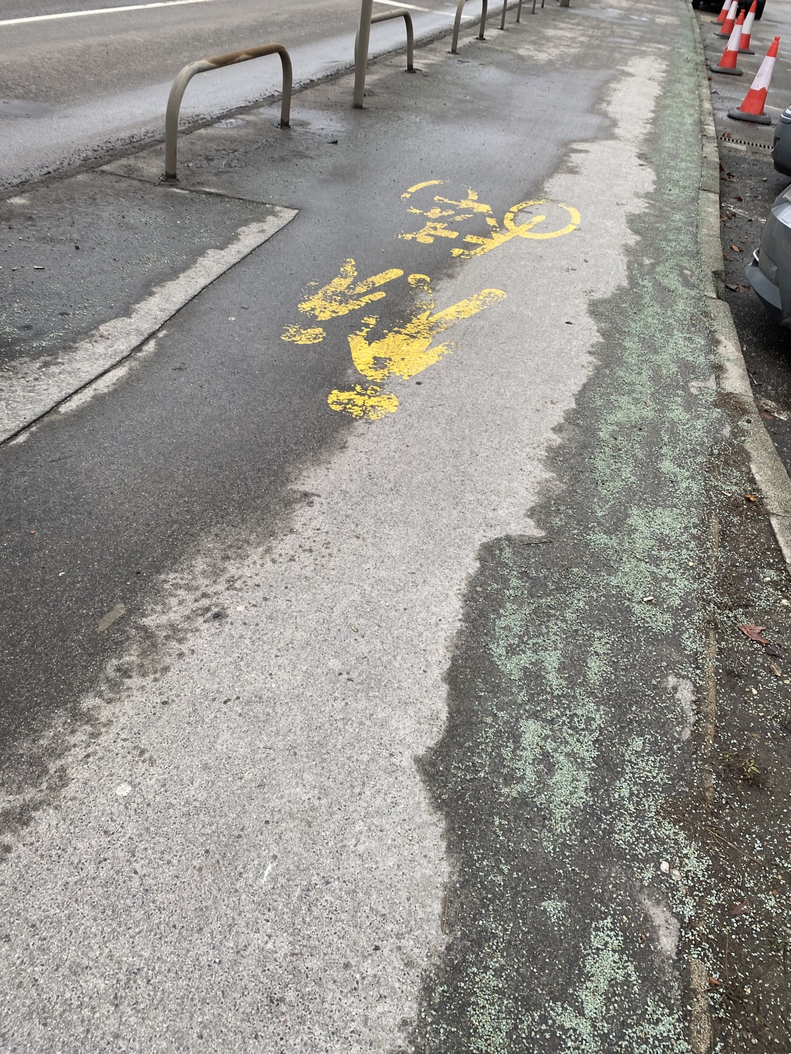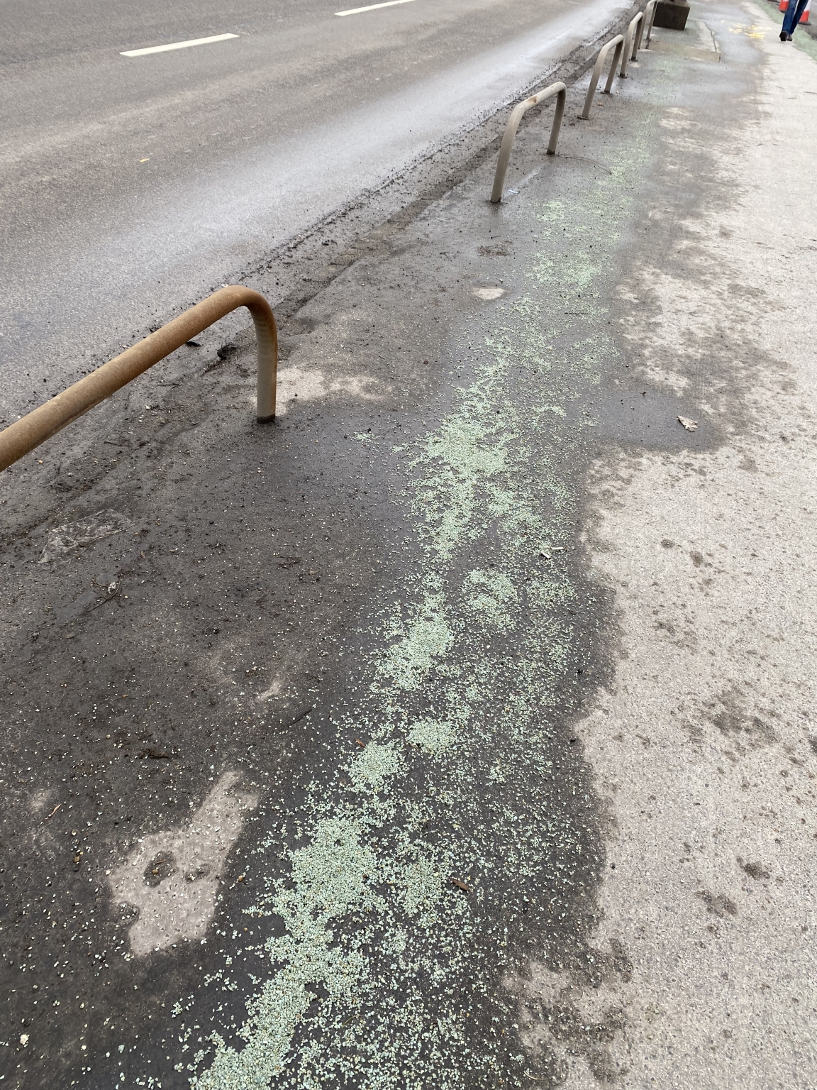 A kerékpárút burkolatán a téli síkosságmentesítésből visszamaradt szóróanyag található; bár nem veszélyes, a terület rendezetlen, a burkolat megtisztítása indokolt.