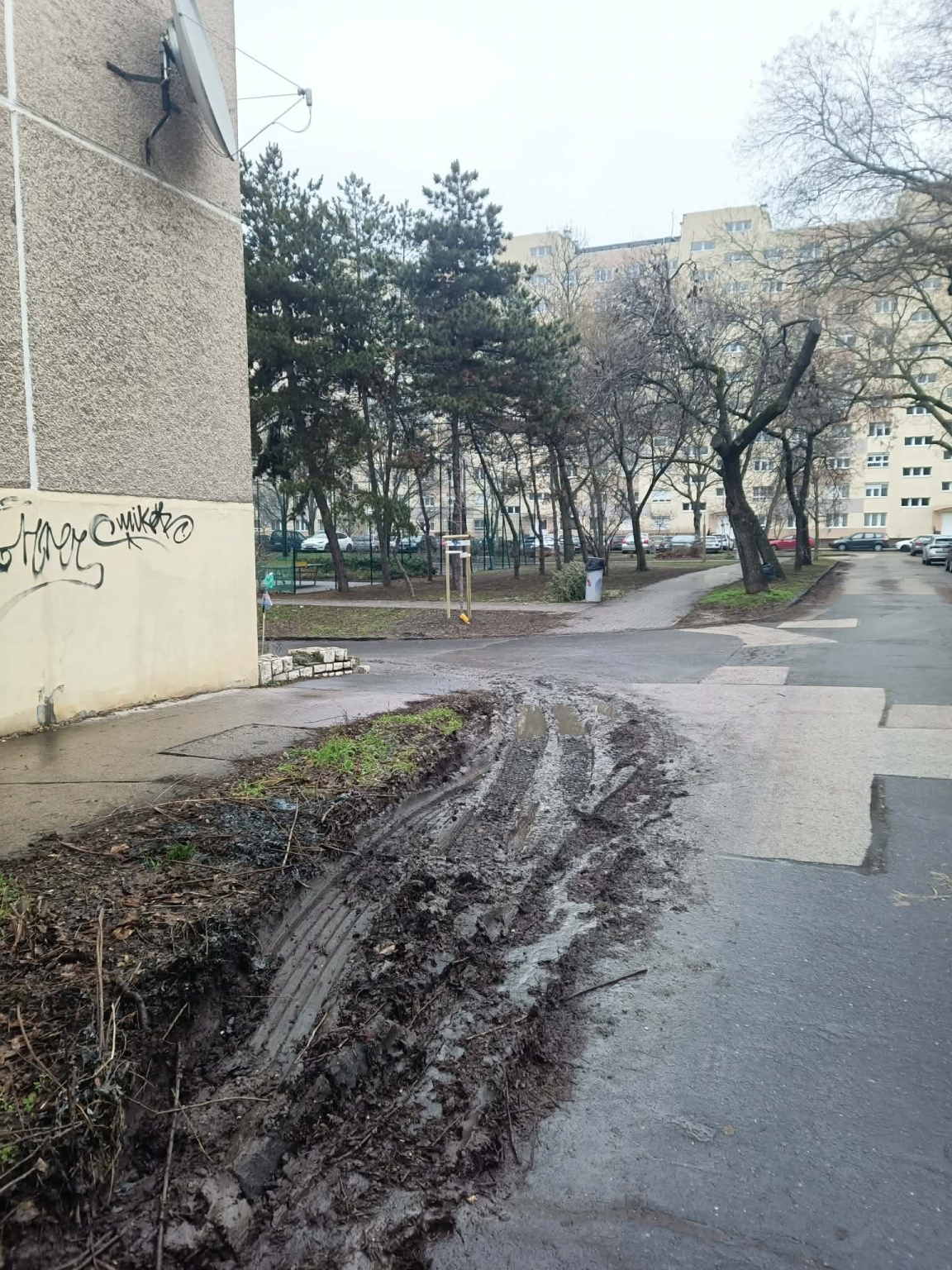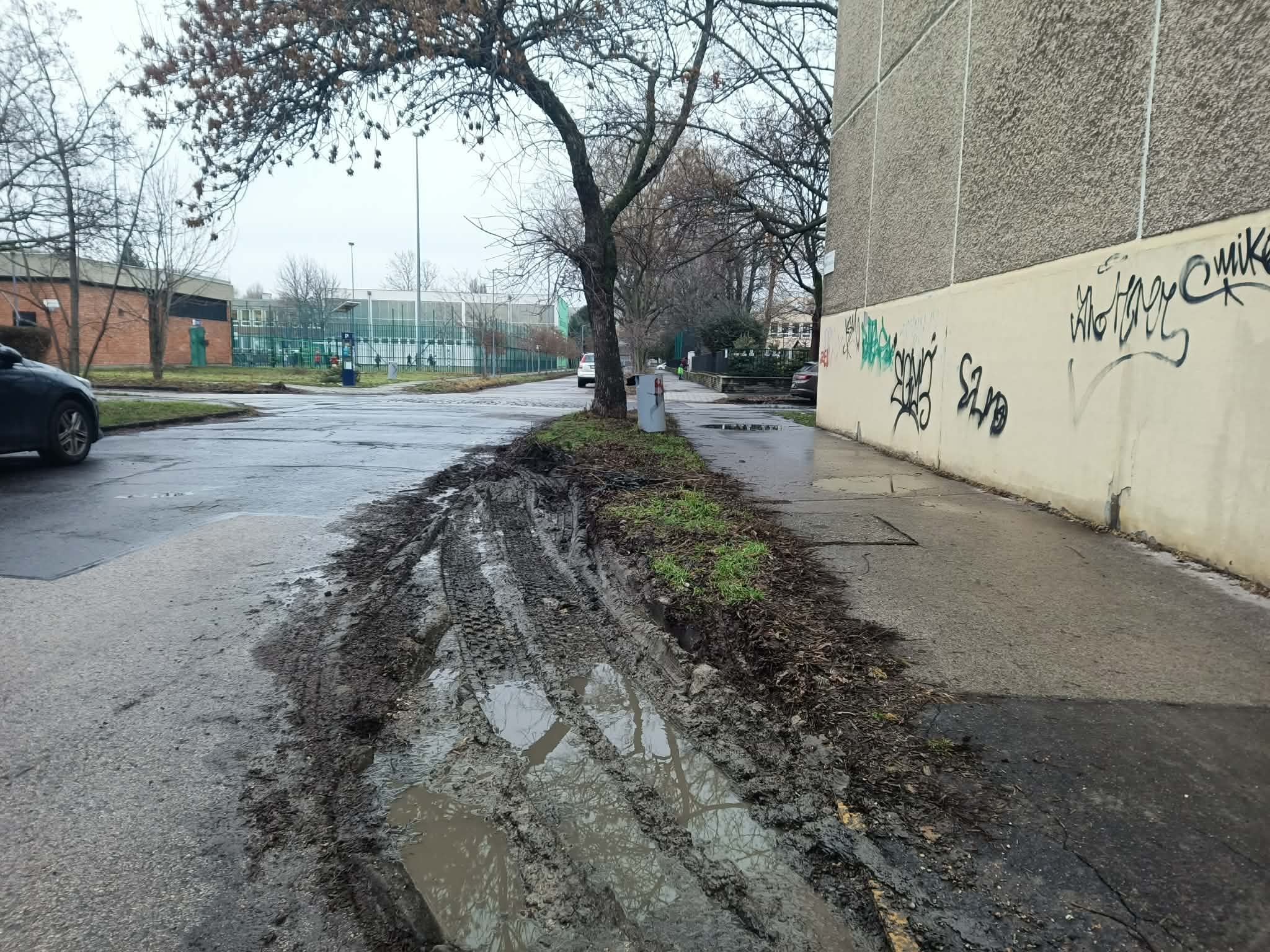 Parkfenntartó, vagy valamilyen tereprendező autók által legyalult (amúgy is rossz állatpotban lévő, eredetileg füves) rész; jelenleg sár tenger, dagonya, esetleg madáritató.