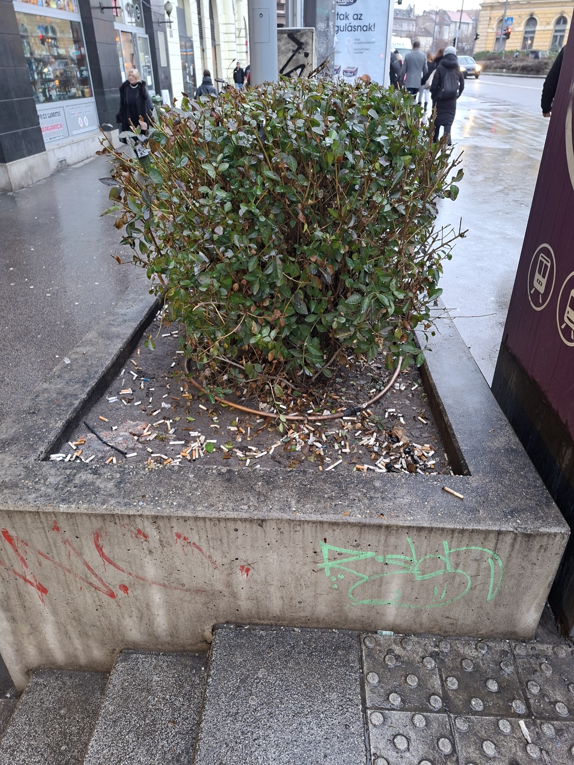 A Keleti pályaudvarnál a belváros felé közlekedő buszok megàllójában rengeteg az eldobott cigarettacsikk. Főleg a díszbokrok tövében.
