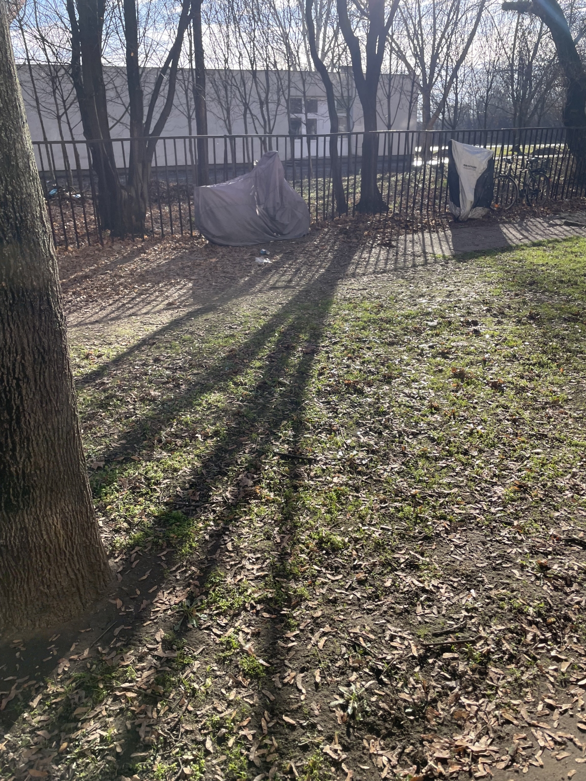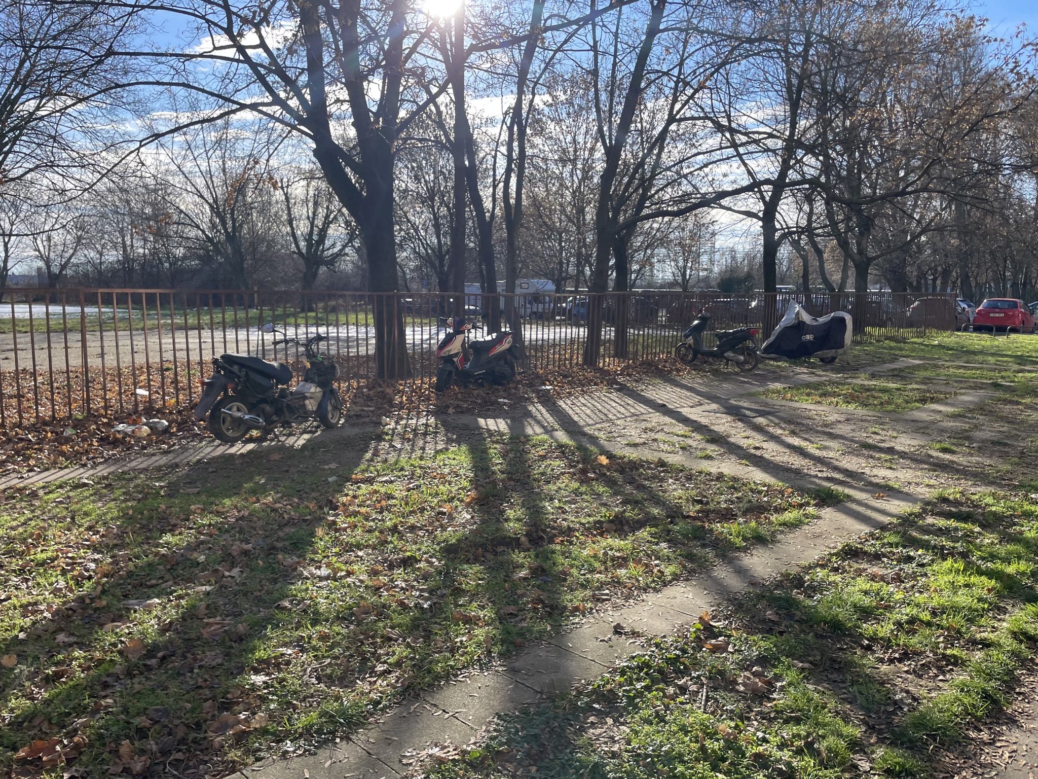 Szamos motor es kerekpar parkol a zold teruleten. Erdemes lenne a haz teljes hosszaban 1/3 es 2/3 reszeknel epiteni egy tarolot hogy a tulajdonosok ne a kozeli iskola keritesehez kossek ki az eszkozoket. Akar e mobilitas pont is letesitheto hogy a rollerek rendezetten keruljenek elhelyezesre.