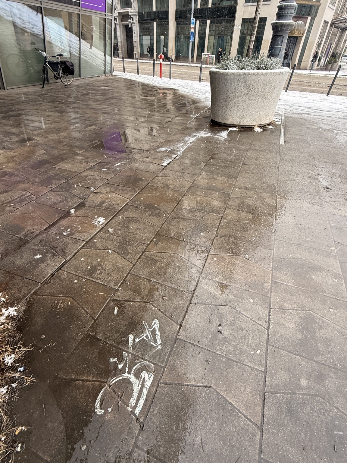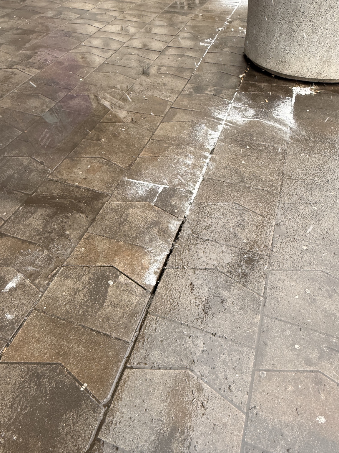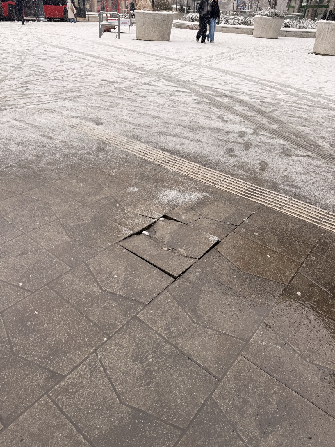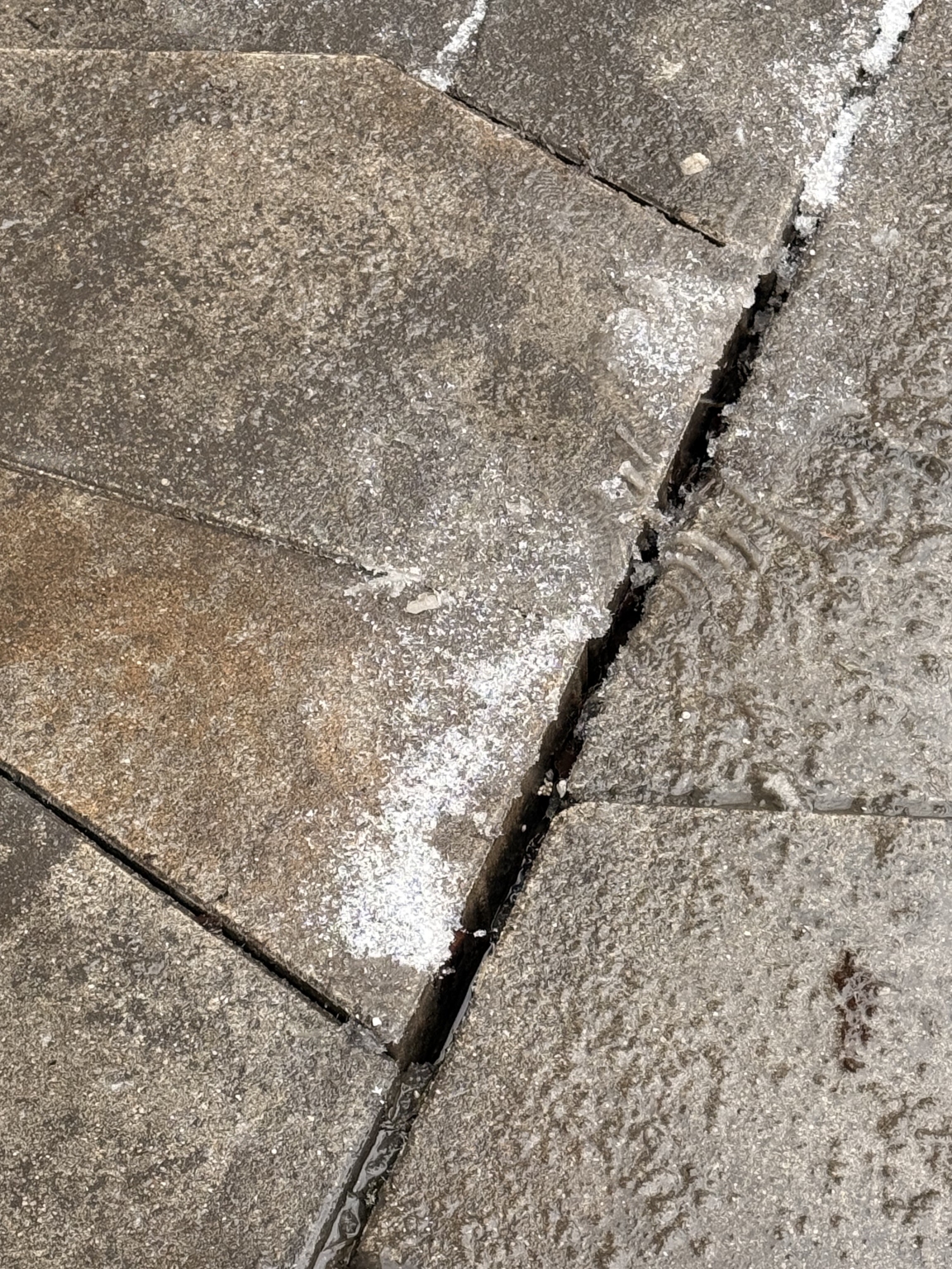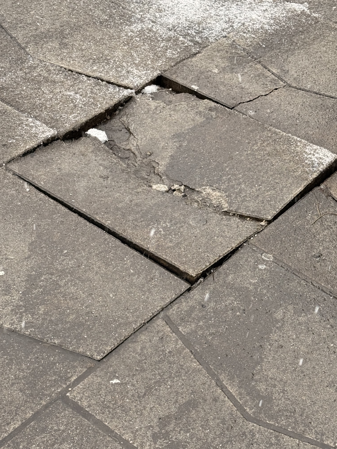 Sérült a járda burkolata, valószínűleg a felhajtó autók miatt. A fotózáskor is egy nagy méretű furgon fordult meg a járdán. 2026.02.03. 13:26-kor. Térfigyelő kamerán visszanézhető.
