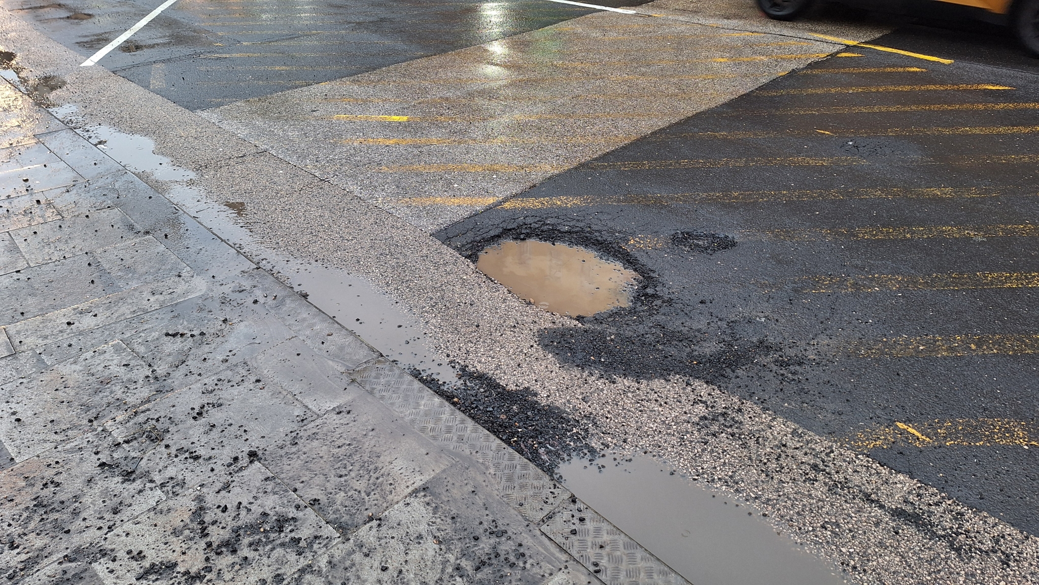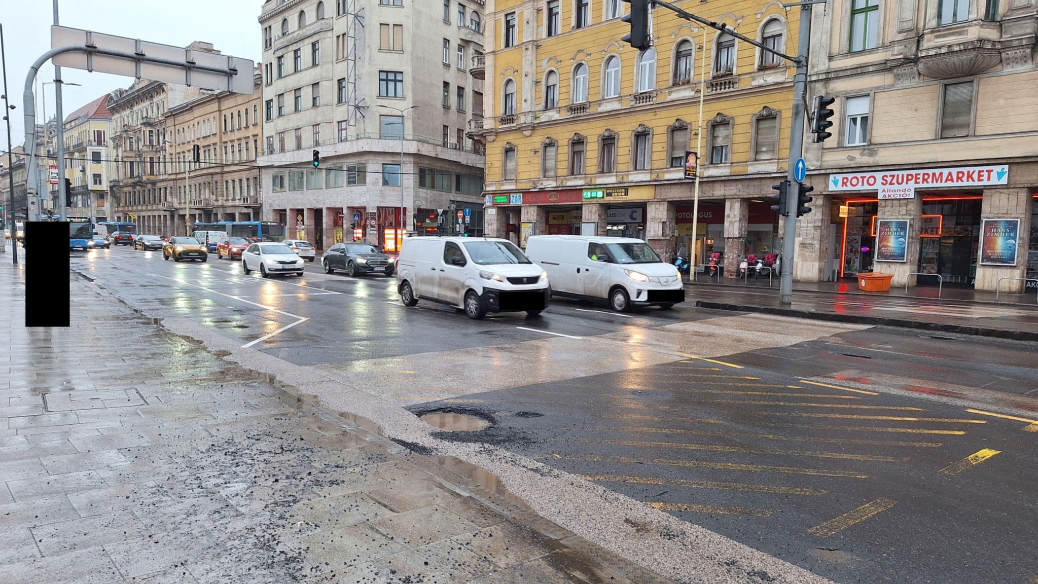 A Blaha Lujza téren a 7-es busz megállója mögött van egy nagy kátyú.