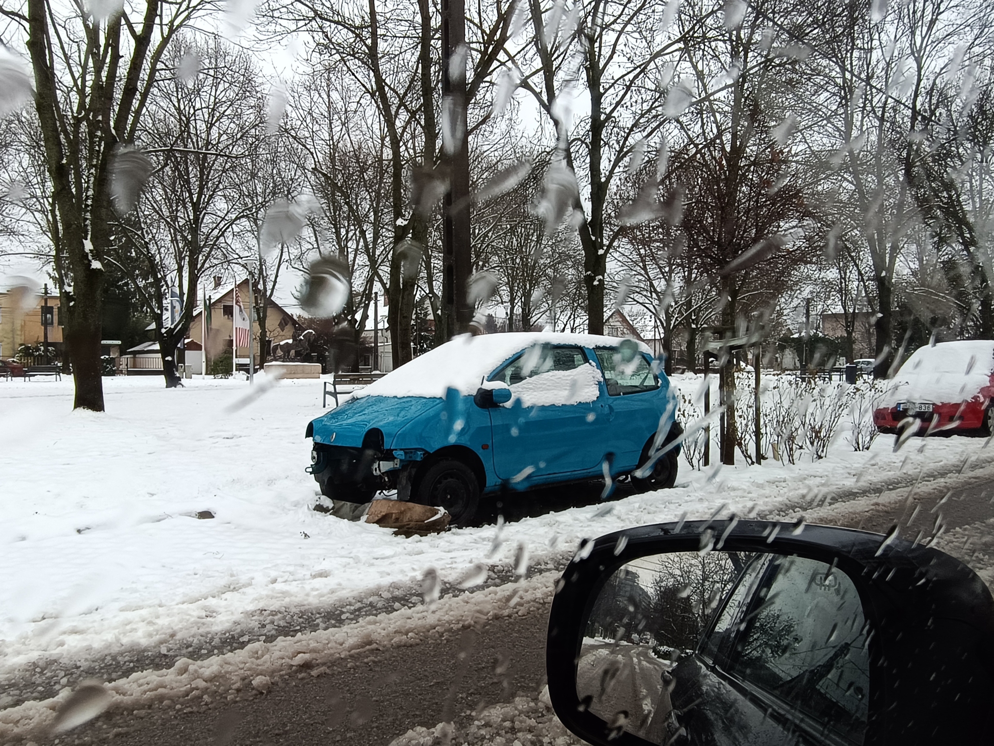 A Lékai bíboros téren a parkoló autók között van egy egykor letakart, mára a már ponyva nélkül álló, egyre jobban kifosztott autó.