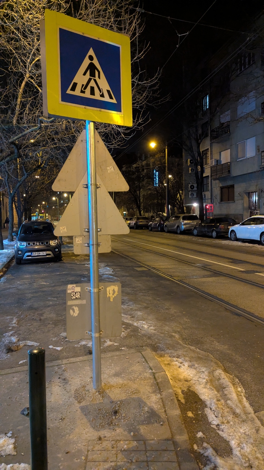 A képen látható tábla kitakarja a gyalogosokat, illetve a gyalogosok számára az érkező járműveket.