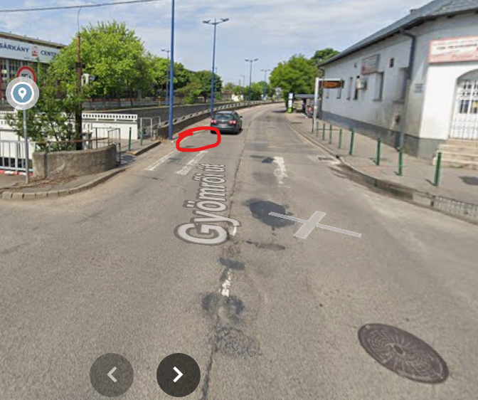 A zebra után elég nagy terjedelmű kátyú található. A képen pirossal jelölve.