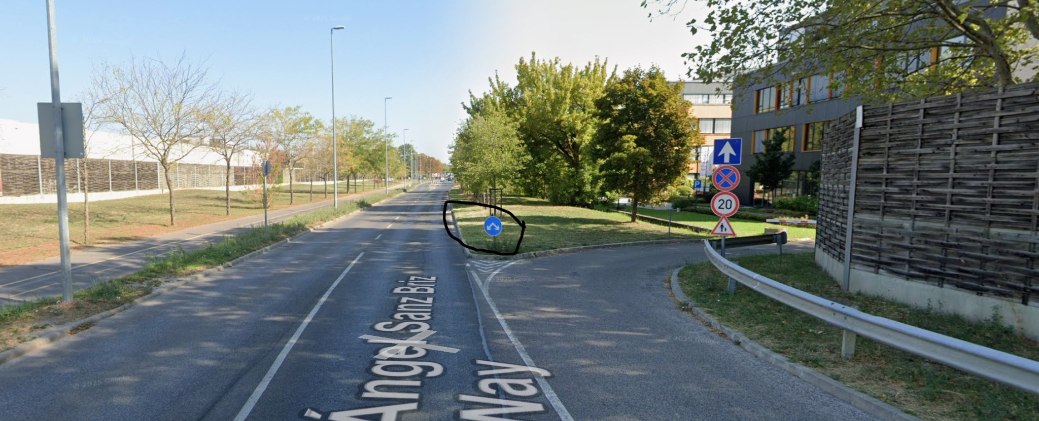 Az Ángel Sanz Briz úton a Graphisoft park felé letérő útnál lévő kikerülési irány táblát valaki telibe találta. Kérem, szíveskedjenek helyreállítani.