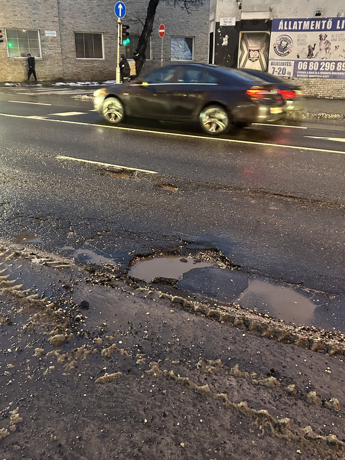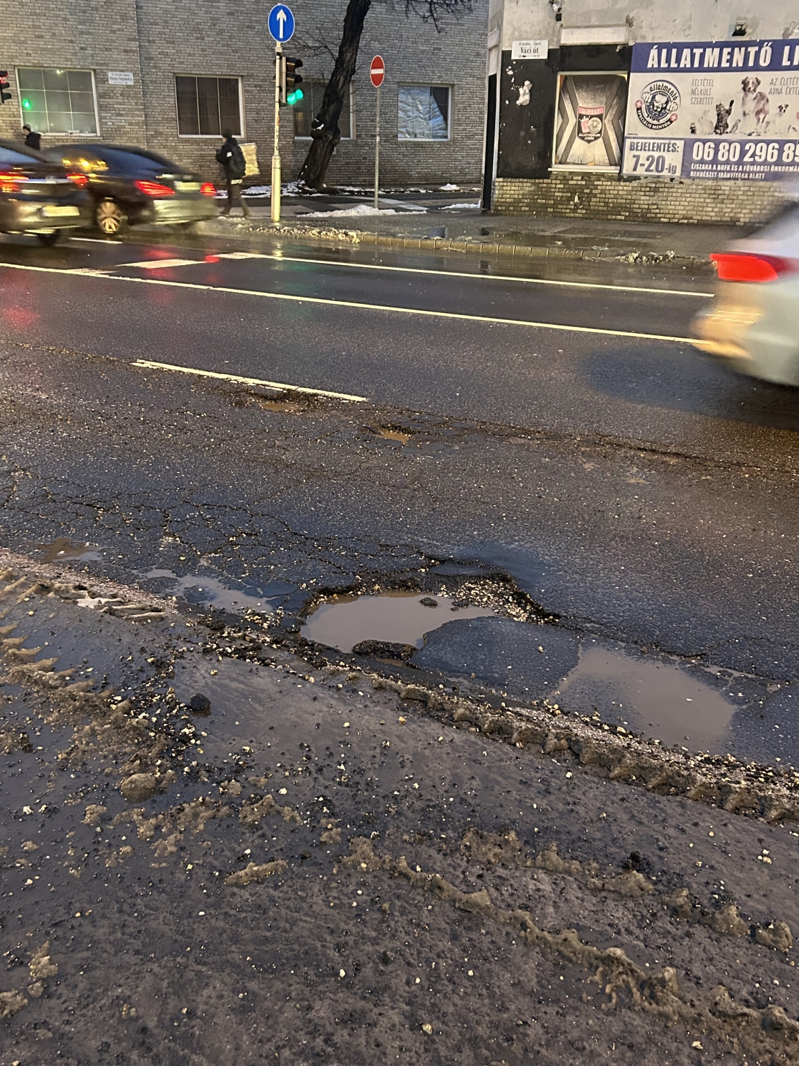A 4. kerületben a Váci úton a belváros felé tartó oldalon a Tímár utcai kereszteződés után a buszmegálló előtt egy hatalmas kátyú akadályozza a forgalmat. Kérem intézkedjenek. Köszönjük!