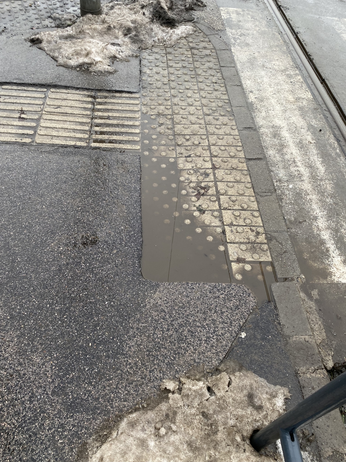 A villamosmegálló mögötti járdaszakaszon a csapadékvíz nem tud elfolyni, ezért tócsák képződnek. A terület a villamosvonal felújítása során került átépítésre. A hibát korábban már javították, azonban a beavatkozás nem bizonyult tartósnak, a probléma visszatért. Kérem a kivitelezés felülvizsgálatát, a hibás szintképzés kijavítását.