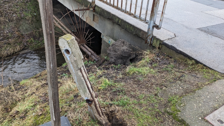 A Bonyhádi út-Gvadányi utca találkozásánál, a Rákos-patak feletti híd korlátja egy szakszon kidőlt.