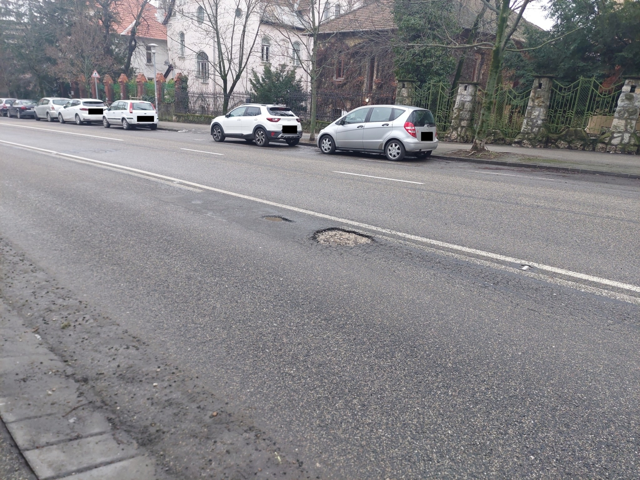 A Bimbó út 21. előtt egy nagyobb és egy kisebb kátyú van a felfelé menő sávban.