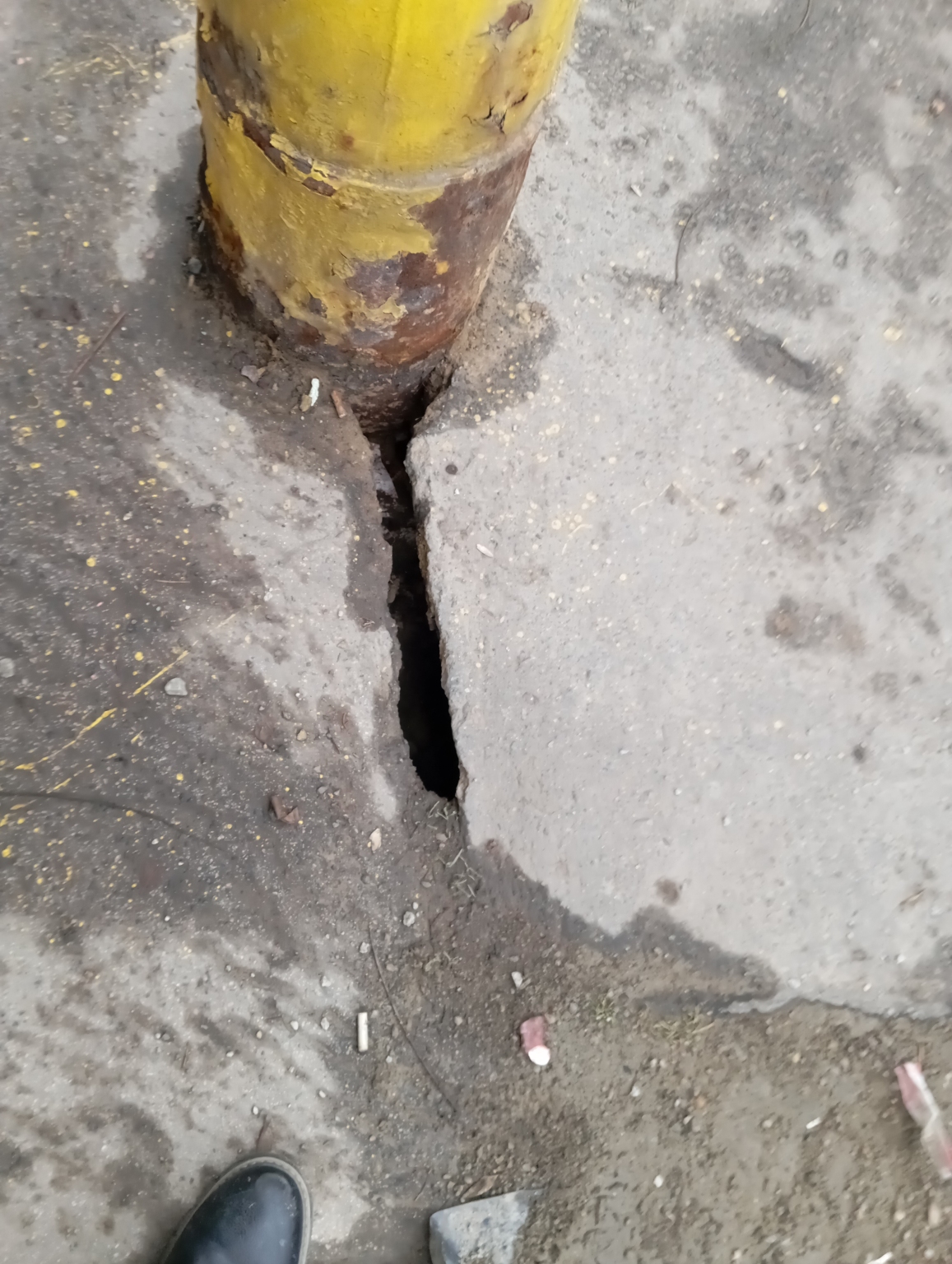 A járdán, közvetlenül egy villanyoszlop tövénél a burkolat megrepedt és beszakadt. A rés elég mély és széles, így könnyen bele lehet lépni, ami balesetveszélyes, különösen sötétben vagy rossz látási viszonyok között. Valószínűleg a talaj megsüllyedt az oszlop körül, ezért a beton is elvált.