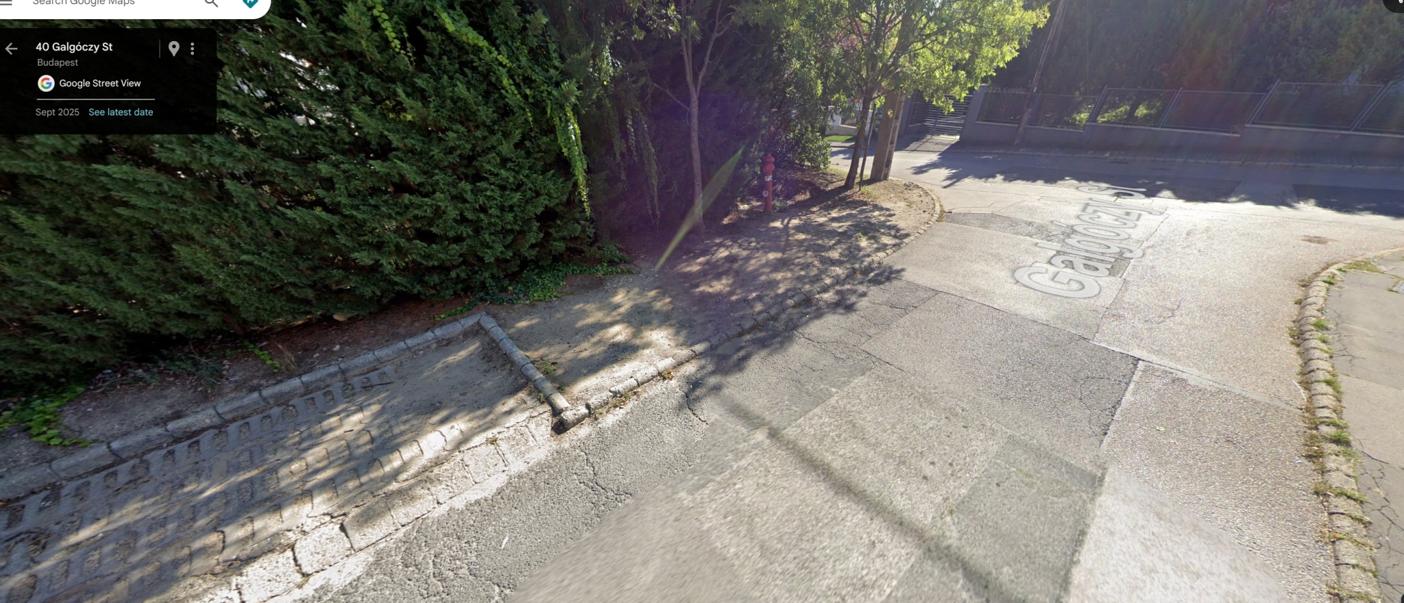 A Google térkép automatikusan a megálló nevét írja ki. Feltöltöttem egy újabb képet a StreetView segítségével, továbbá elmozgattam a jelölőt, hogy pontosabban írja ki a helyszínt. Ezen látható, hogy az érintett szakasz valójában a Galgóczy utca torkolata előtti rész, a tűzcsap előtt. Véleményem szerint az utca ezen szakasza a kerület kezelésében van.”