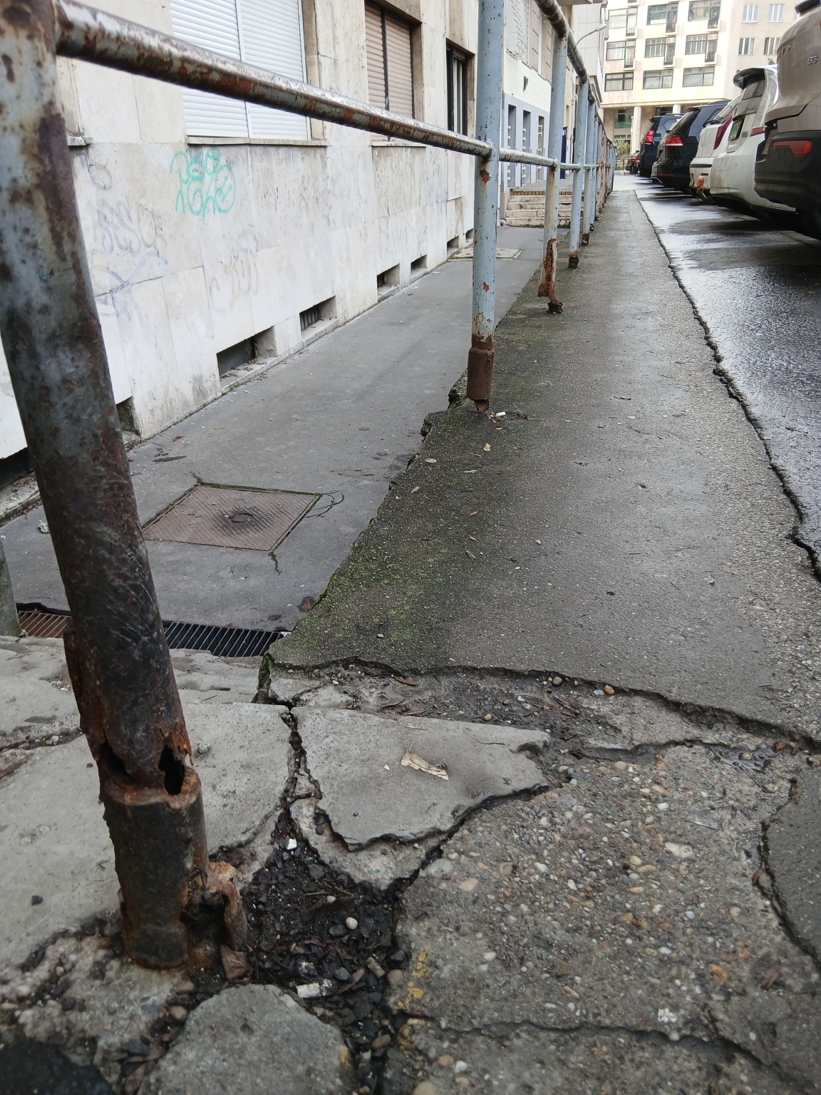 Van egy hosszú korlát a ház mellett a járdán. Ez lifeg, a talpak ki vannak rohadva, elrozsdásodva. Kapaszkodásra alkalmatlan, kissé balesetveszélyes.