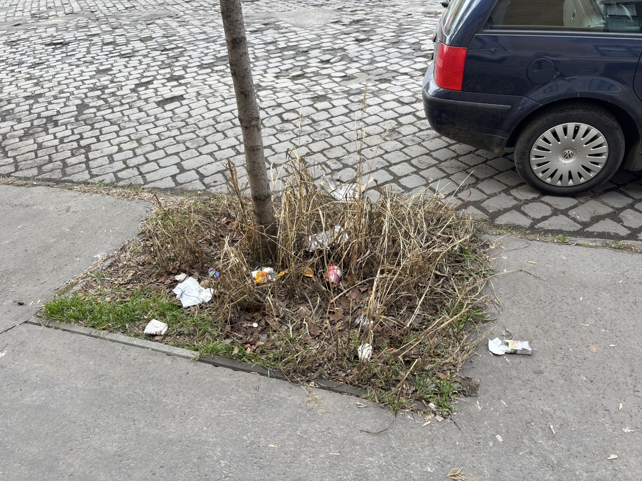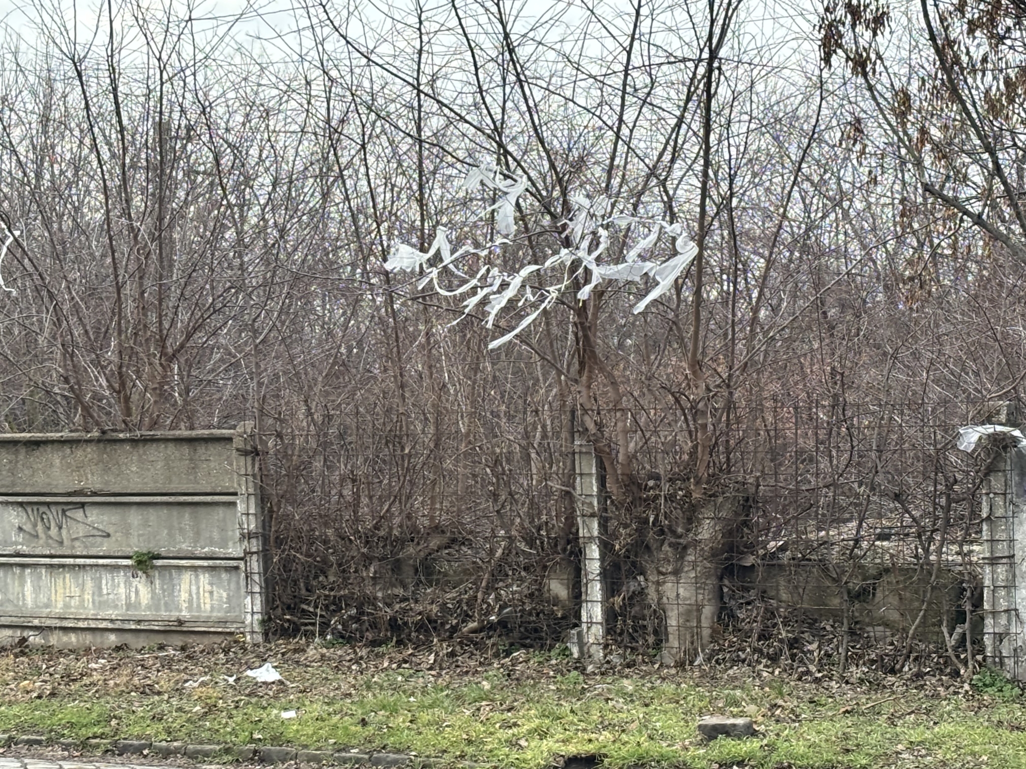 X. kerület Korponai utca mentén sajnos nagy mennyiségű szemét van elszórva. A fák ágaira pedig nejlon darabok vannak csavarodva.