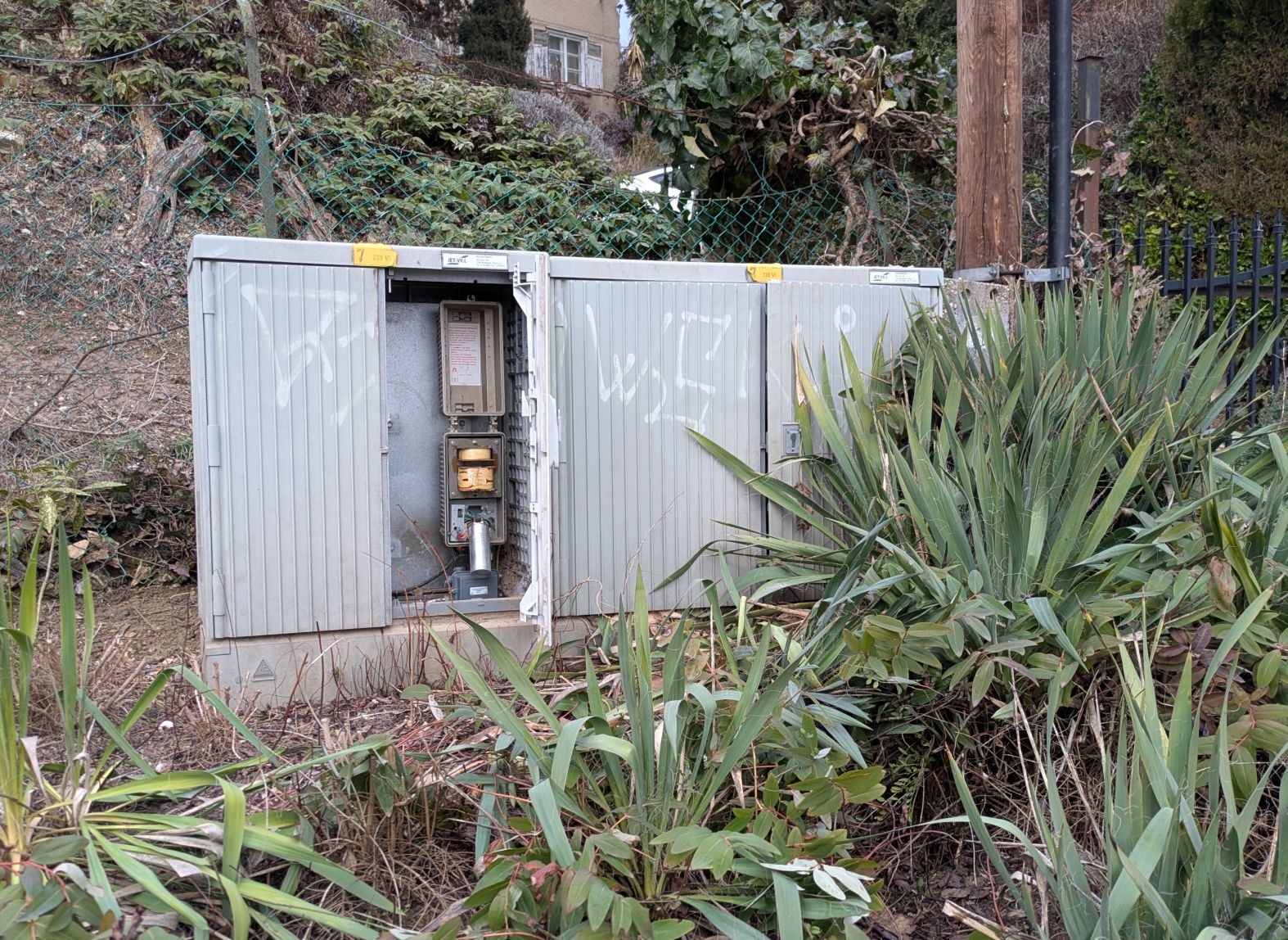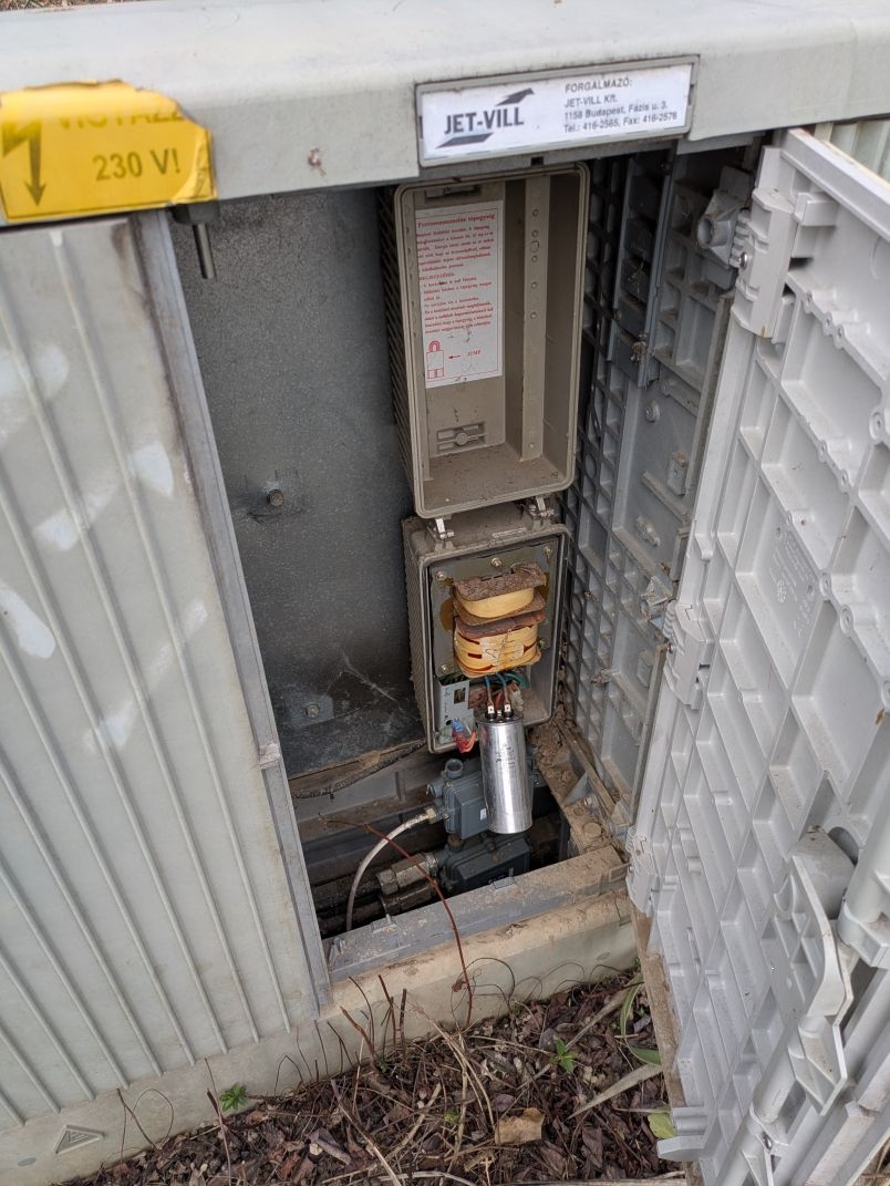 Bp. II. ker. Nagybányai út 41/C előtt lévő távközlési elosztó szekrény ajtaja nyitva van. Úgy tűnik, mintha rongálás is törtönt volna, mert a benne lévő eszközök is szét vannak bontva.