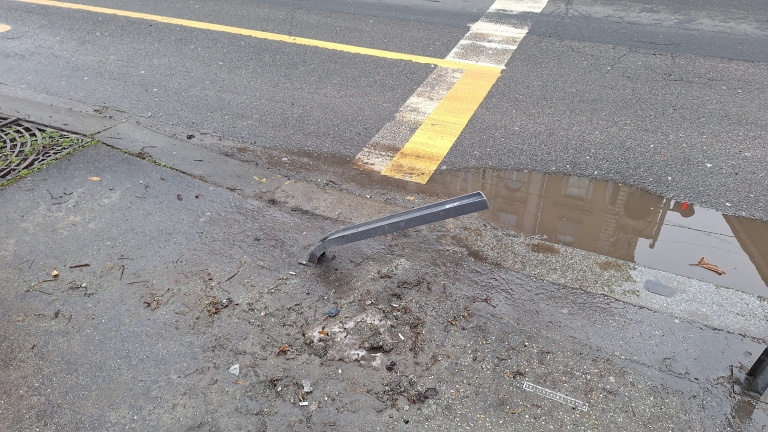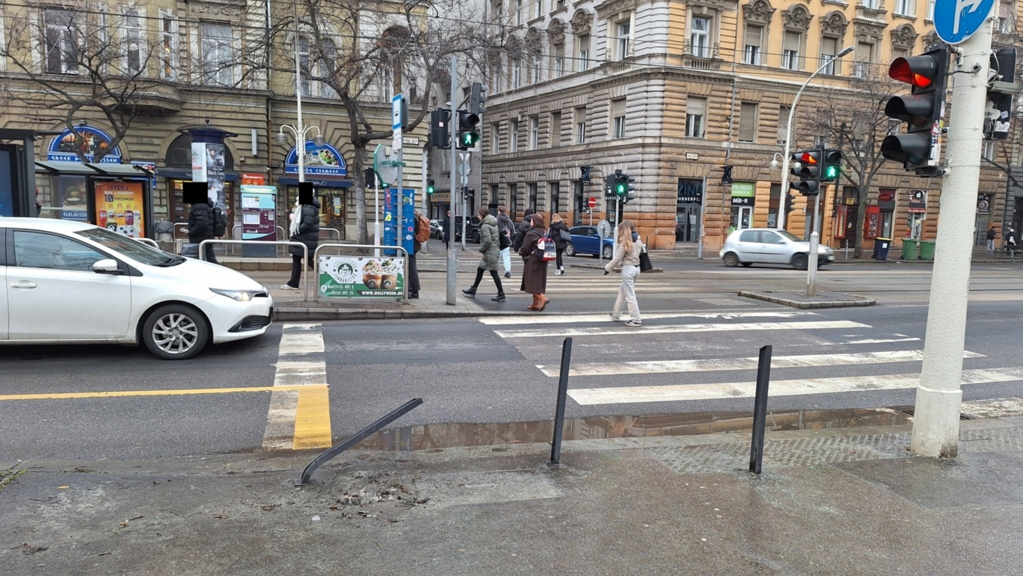 A Rákóczi téren az egyik zebránál eldeformálódott egy poller.