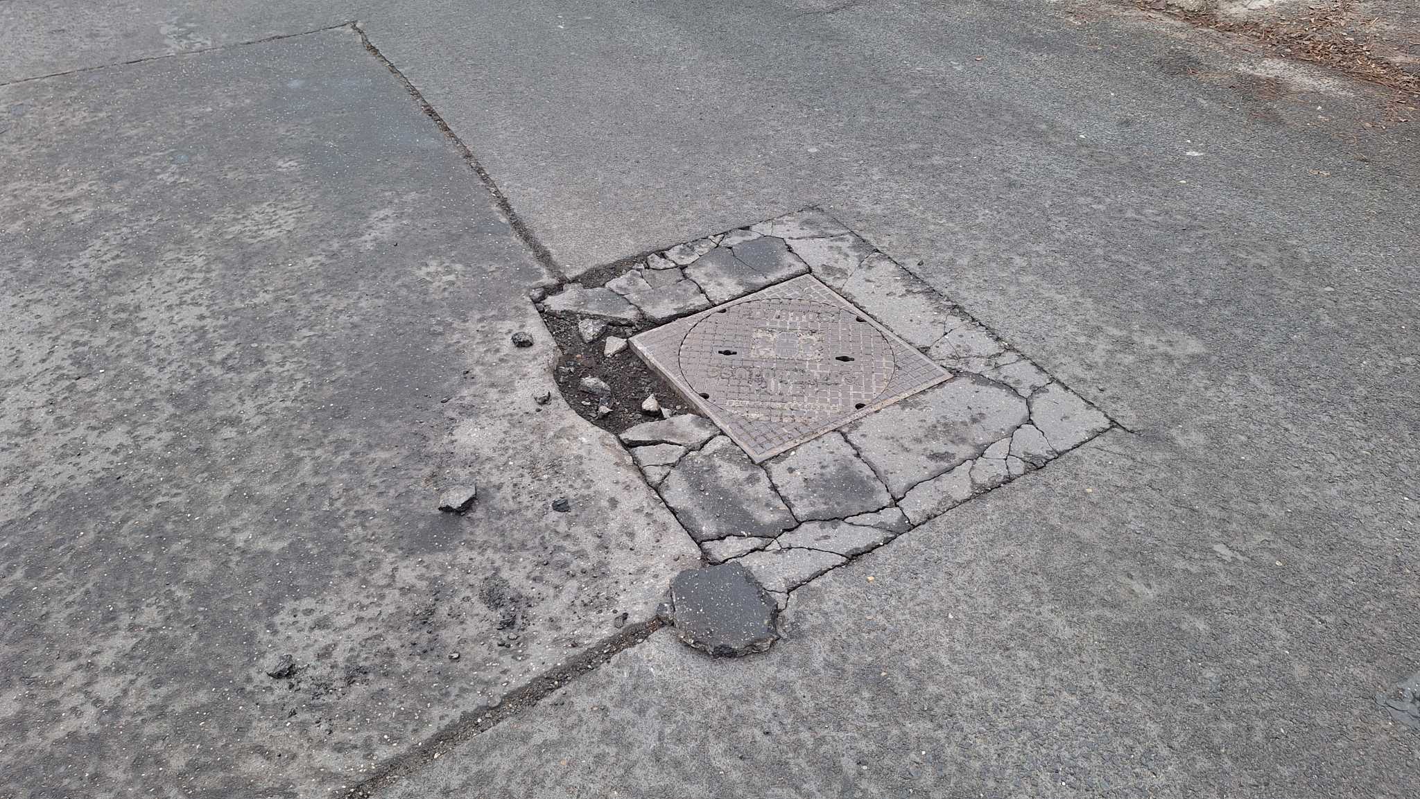 A Vécsey utca 62. előtt kátyúsodni kezdett a csatornafedél körüli aszfaltburkolat.