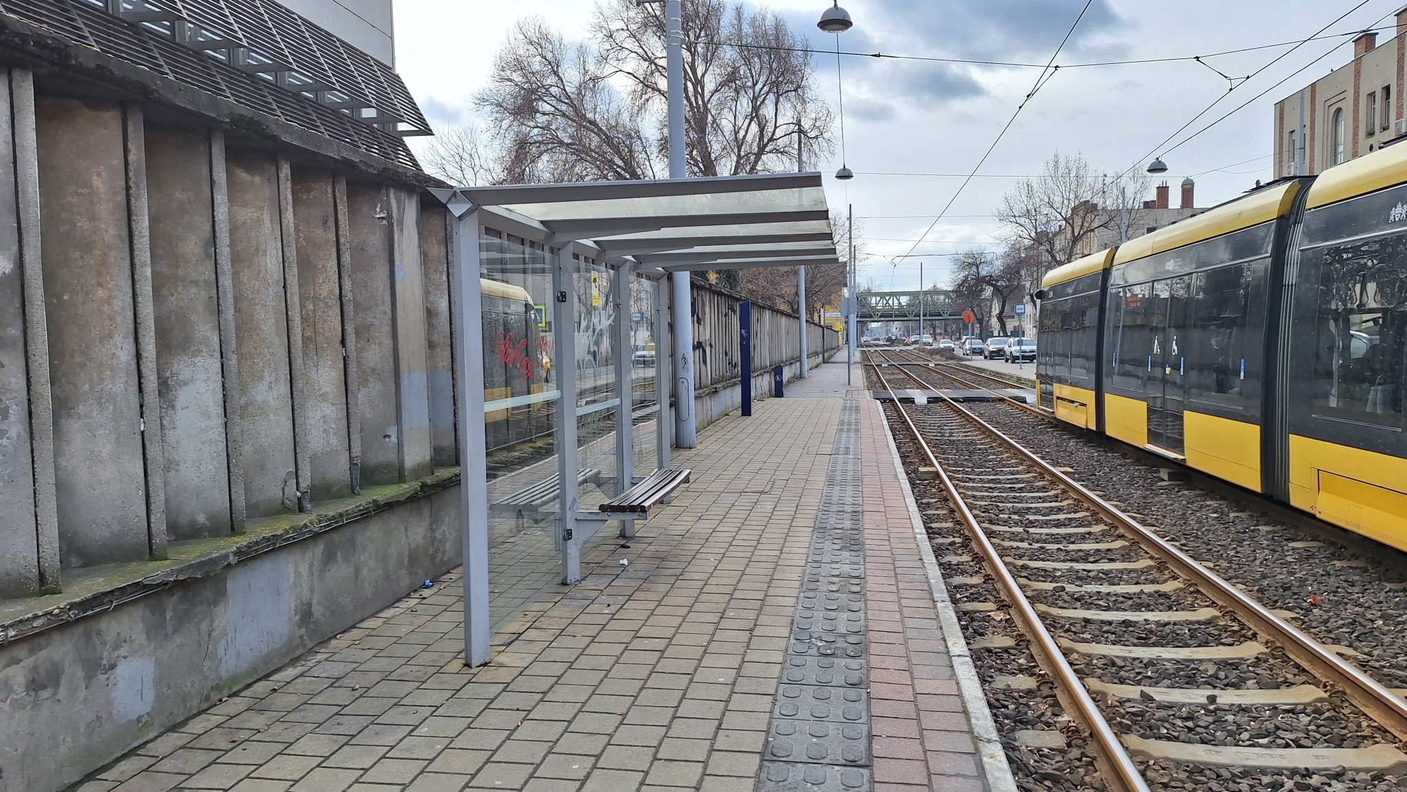 A 3-as villamos Kocsis Sándor Sportközpont megállójában mindét irányban össze vannak firkálva a várók üvegfelületei.