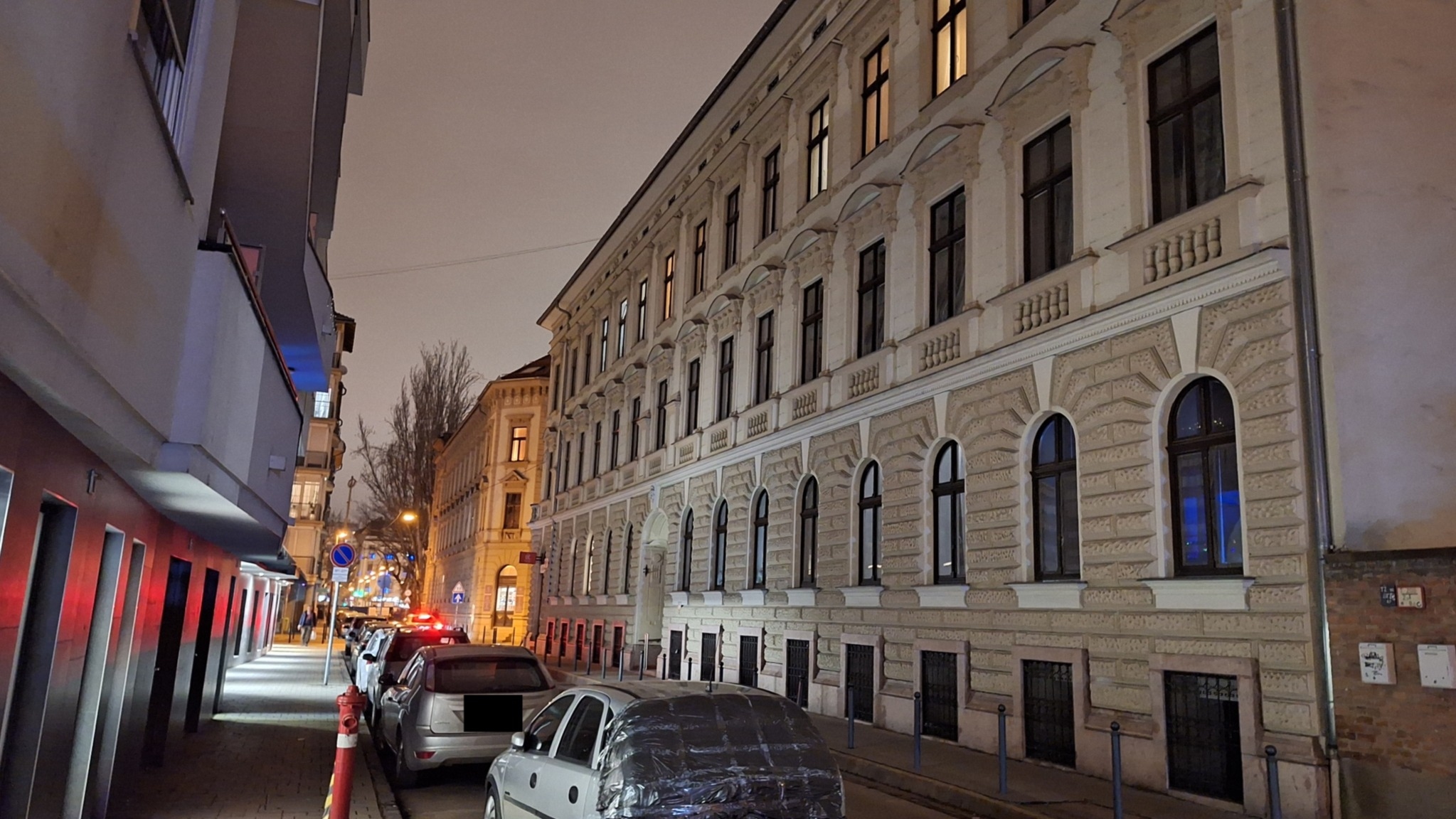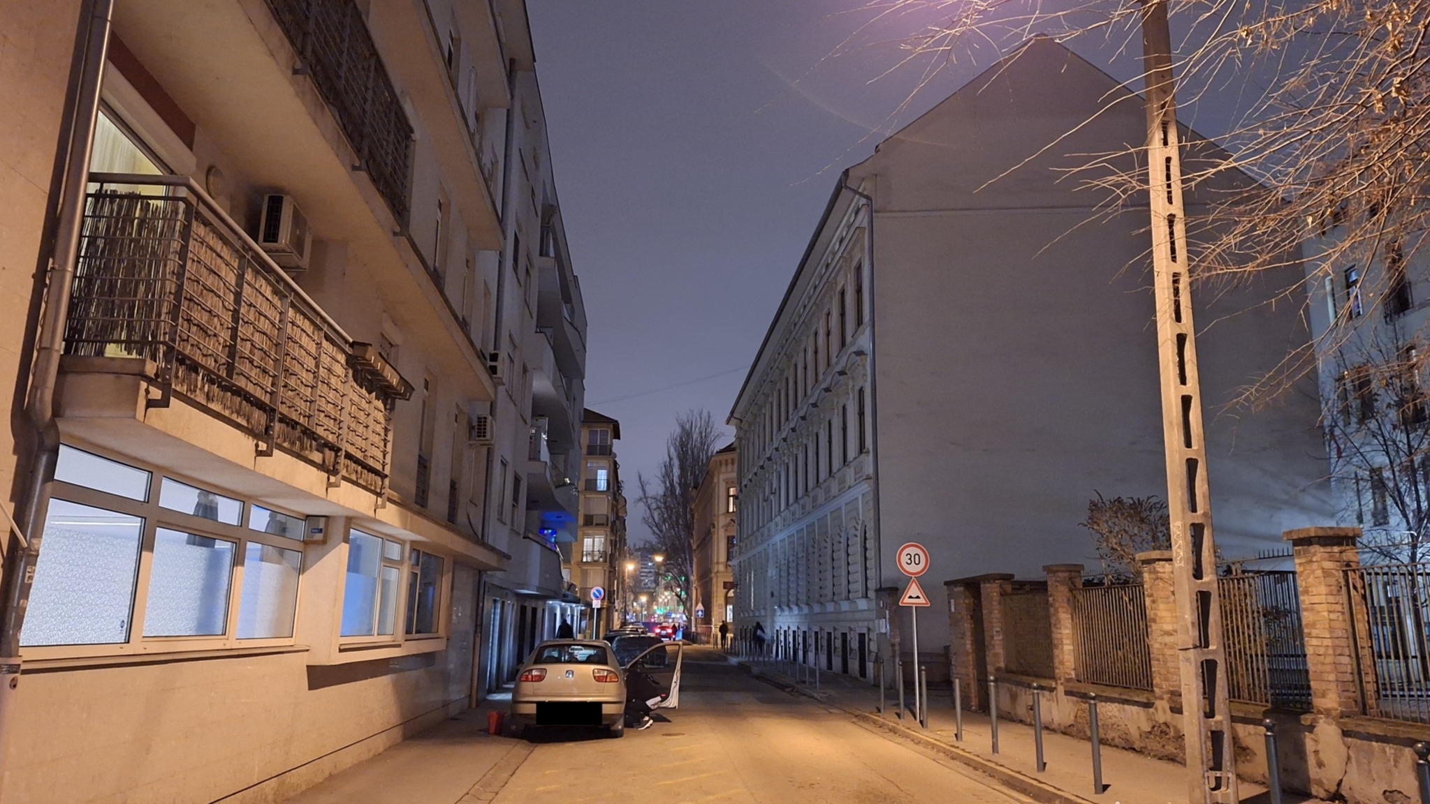 A Thaly Kálmán utca 19. előtt nincs kiépített közvilágítás, láthatóan sötét az utca ezen szakasza.