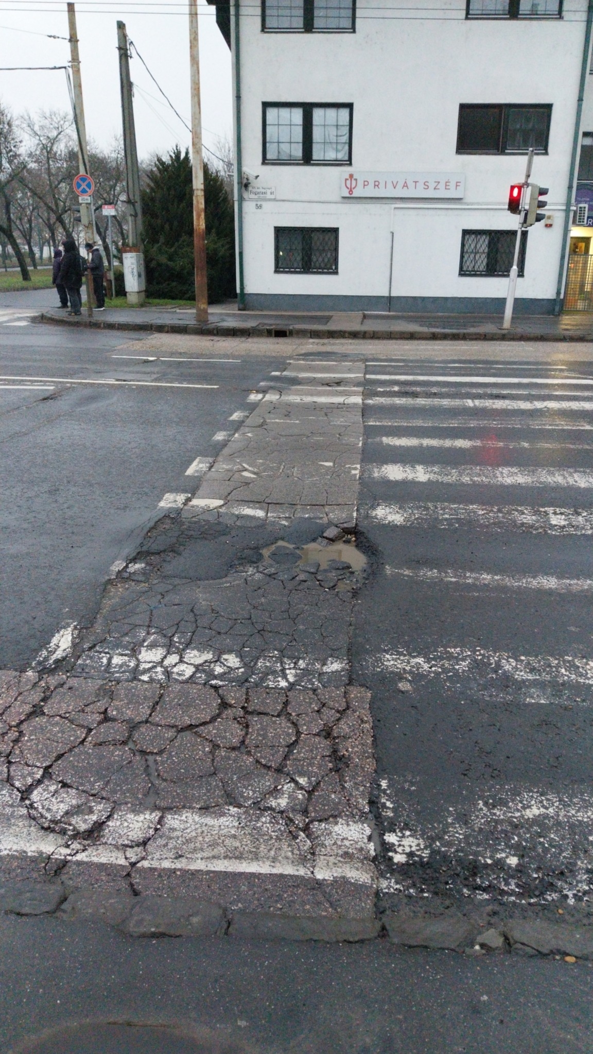 Zuglóban, a Fogarasi út és a Róna utca kereszteződésében, a két trolimegálló közti zebrán méretes kátyú fenyegeti nem csak az autókat, de a gyalogosokat is.