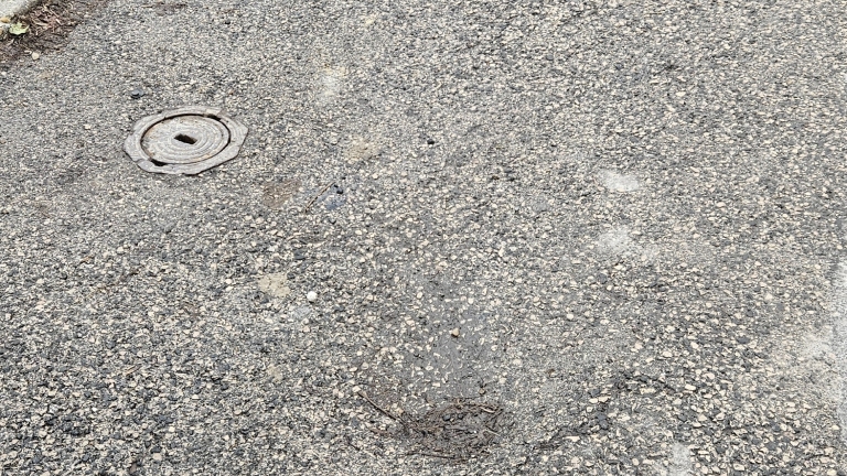 Az útburolatban itt van egy besüllyedés, nagyjából 10 centi, elég rosszul látható. Balesetveszélyes.