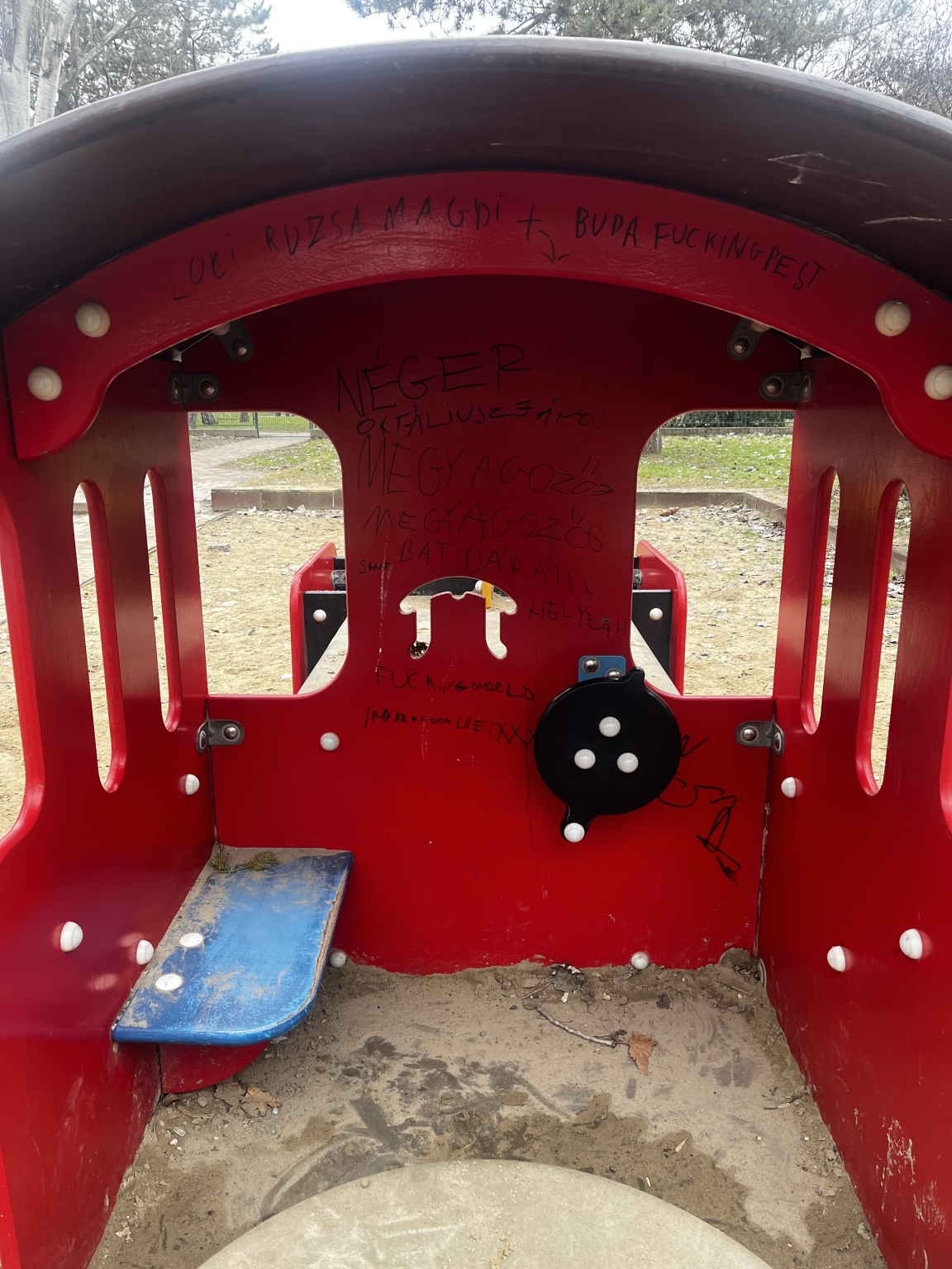 9.kerület József Attila lakótelep nagyjátszótéren a fa vonat játék belső része össze van firkálva.