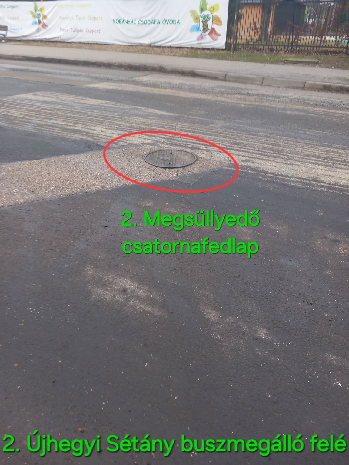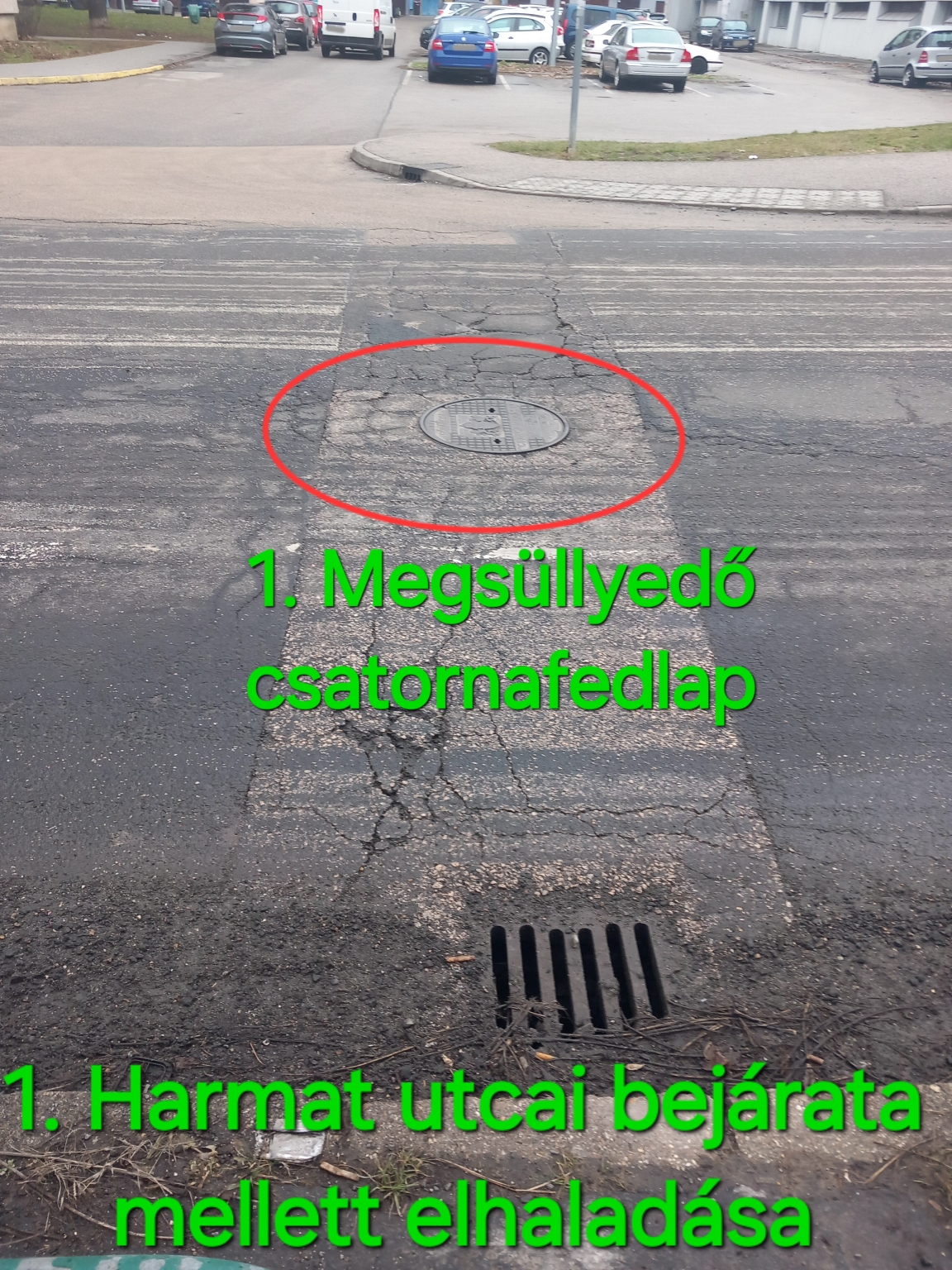 Értesítem hogy Harmat utcai útvonalon 85 ös, 85E, 68 as, 268 as, 117 es és 185 ös autóbusz vonalán, mind kettő csatornafedlap megsüllyedés látható ami kilengéseken kárt okozhat