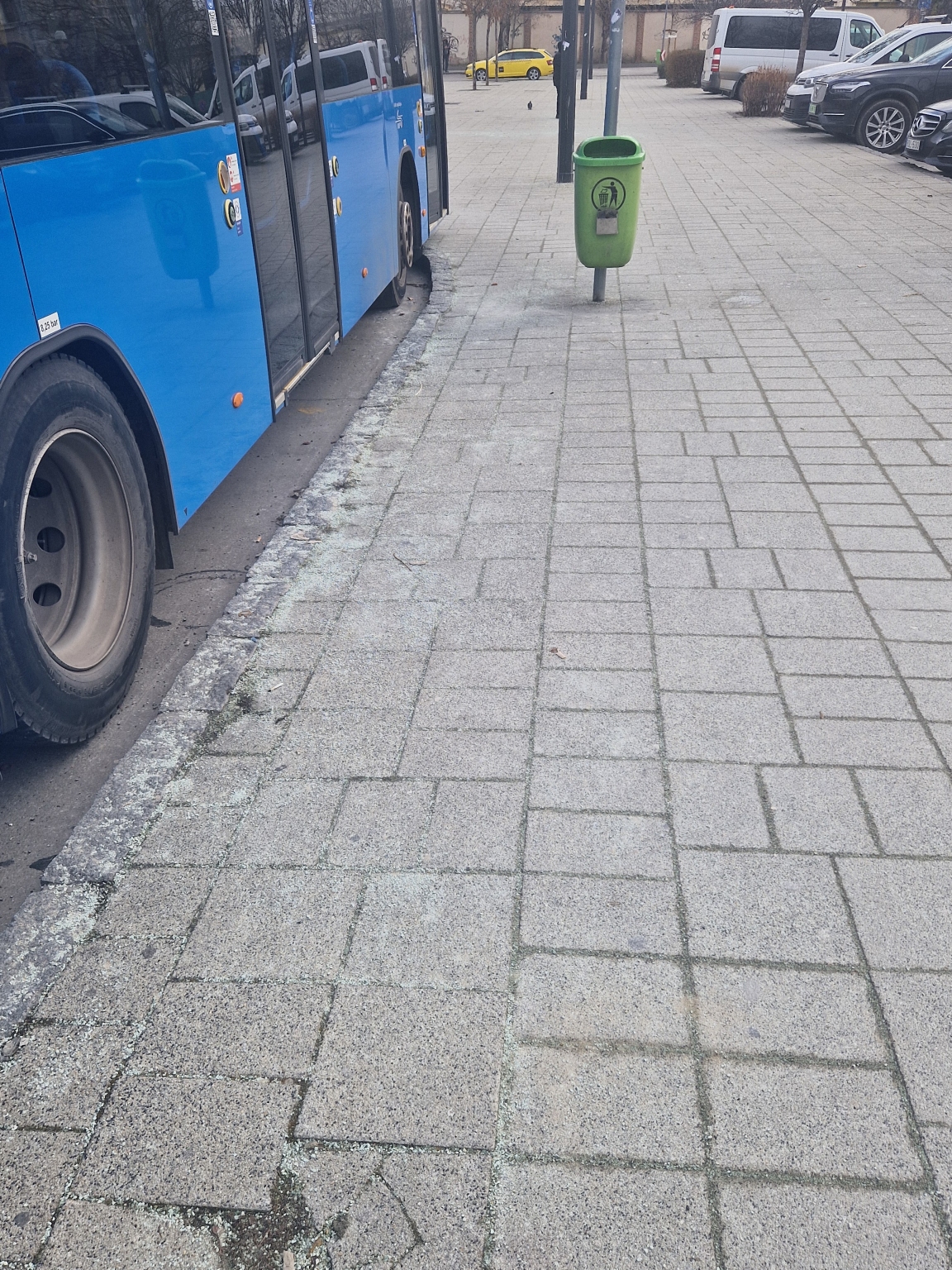 Buszmegállóban apró kavicsokat szórtak amikor havazott, nem olvadt el a jég, de legalább most is balesetveszélyes a talp alatt... össze kell takarítani, és nem ilyennel szórogatni.