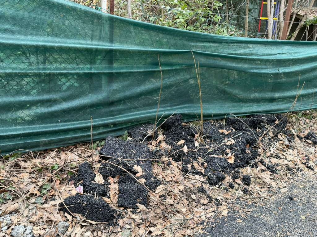 Útjavításból származó aszfalt hulladék a kerítés mellett