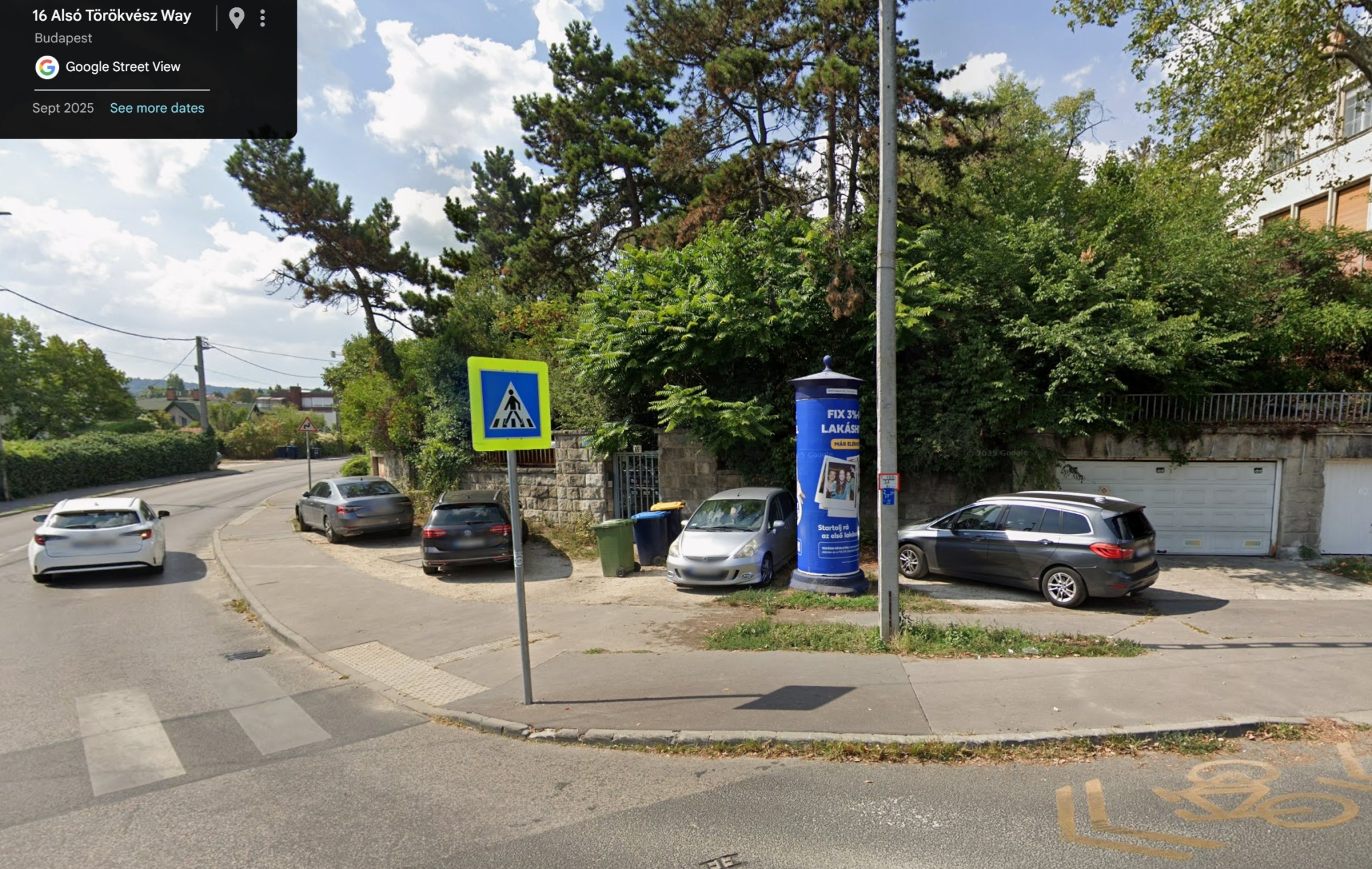 Az Alsó Törökvész út alsó végénél lévő gyalogátkelőhely táblát a minap állították vissza. Most nem döntötték ki, csak megdöntötték. Körülbelül 30 fokban állhat a függőlegeshez képest. Kérem, egyenesítsék ki, mielőtt teljesen kidől megint
