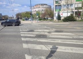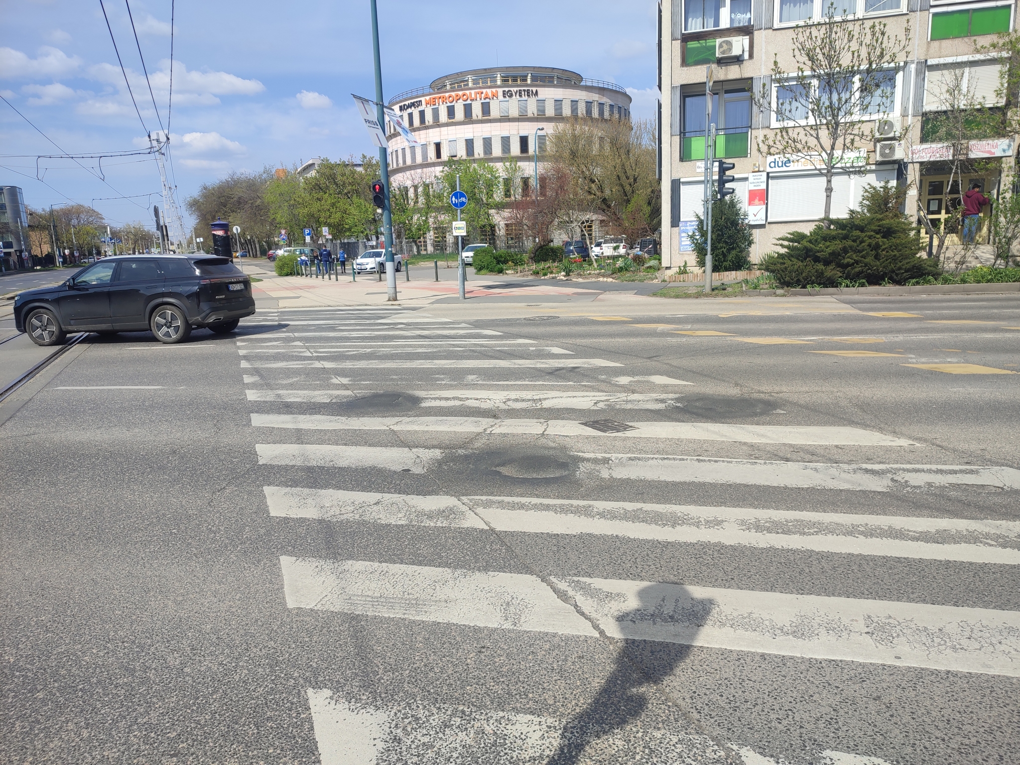 Botlásveszélyes kátyúk a Füredi utca - Nagy Lajos király útja csomópontban, a zebrán.