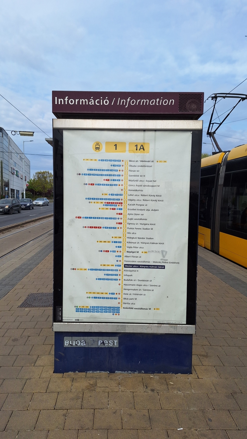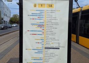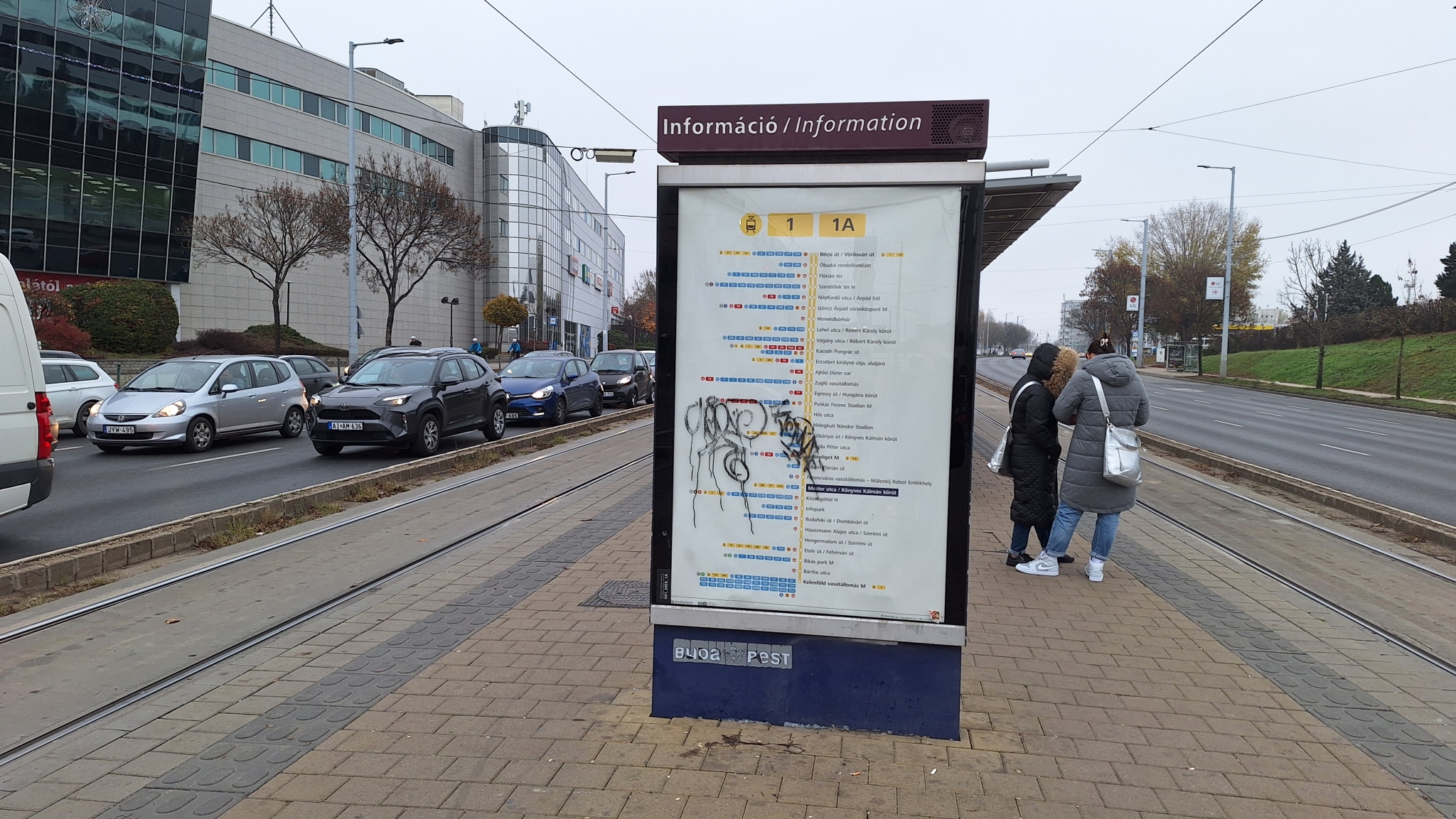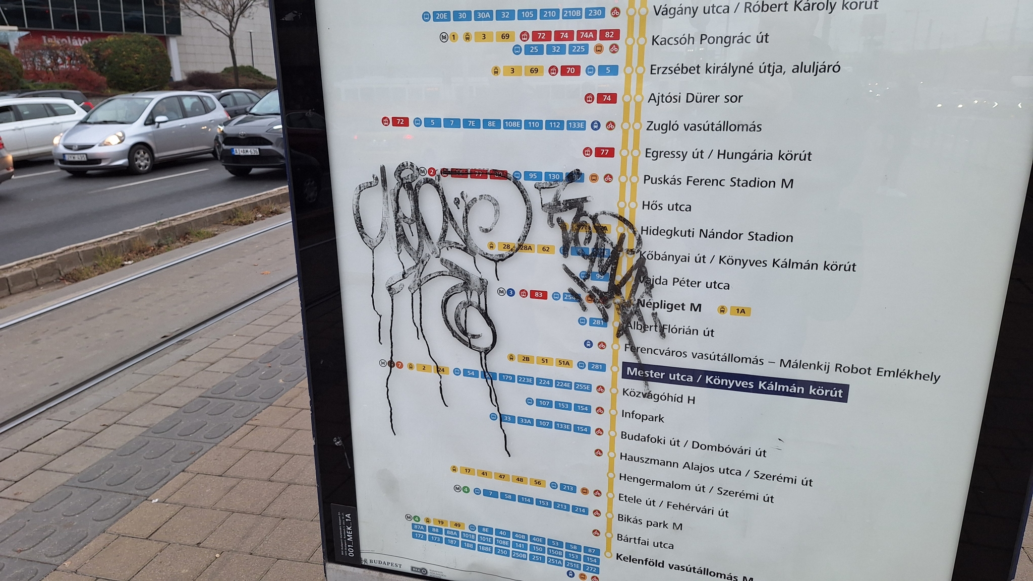 Az 1-es villamos Mester utca / Könyves Kálmán körút megállójában össze van firkálva a megállókiosztást ábrázoló tábla.