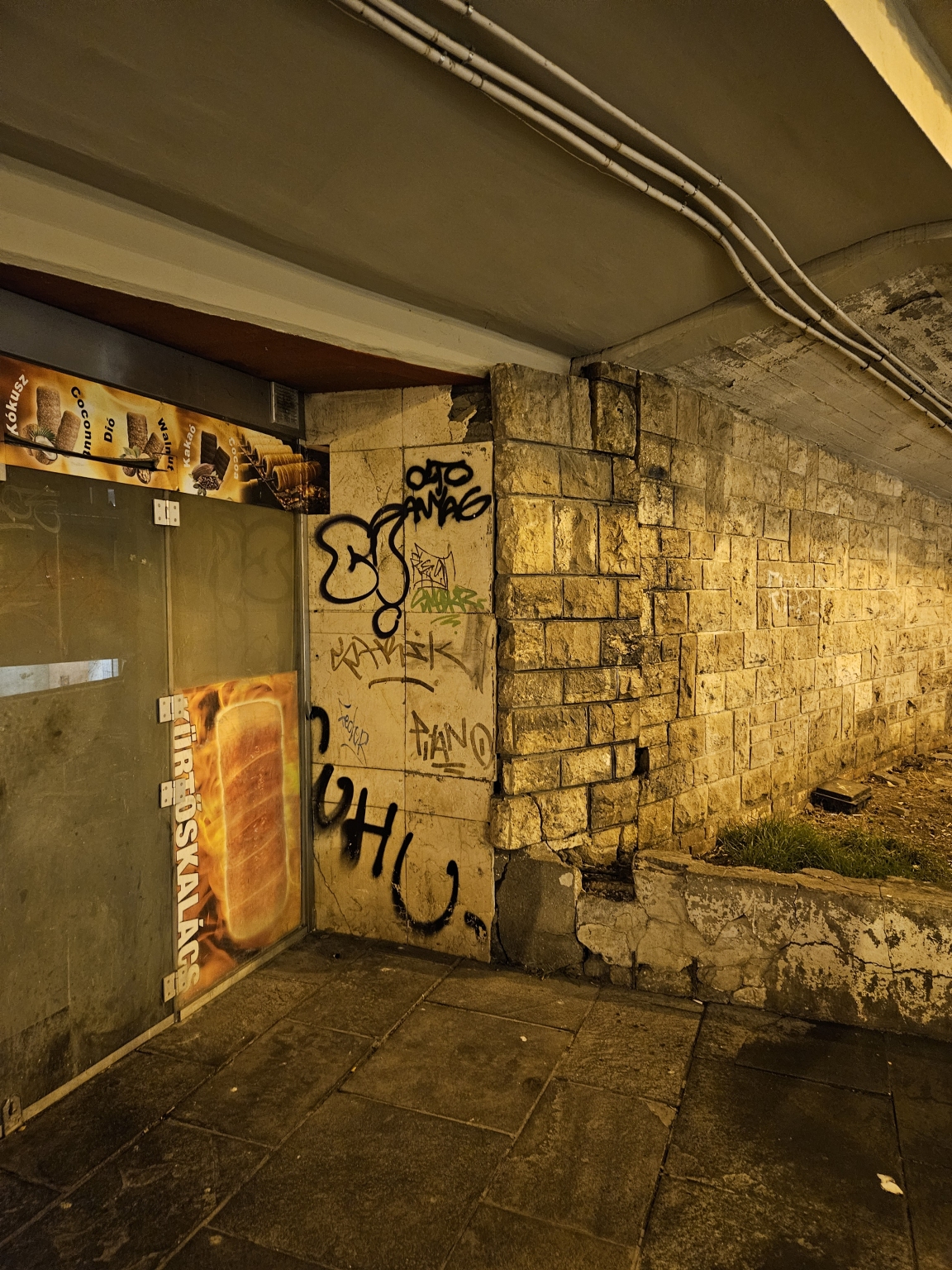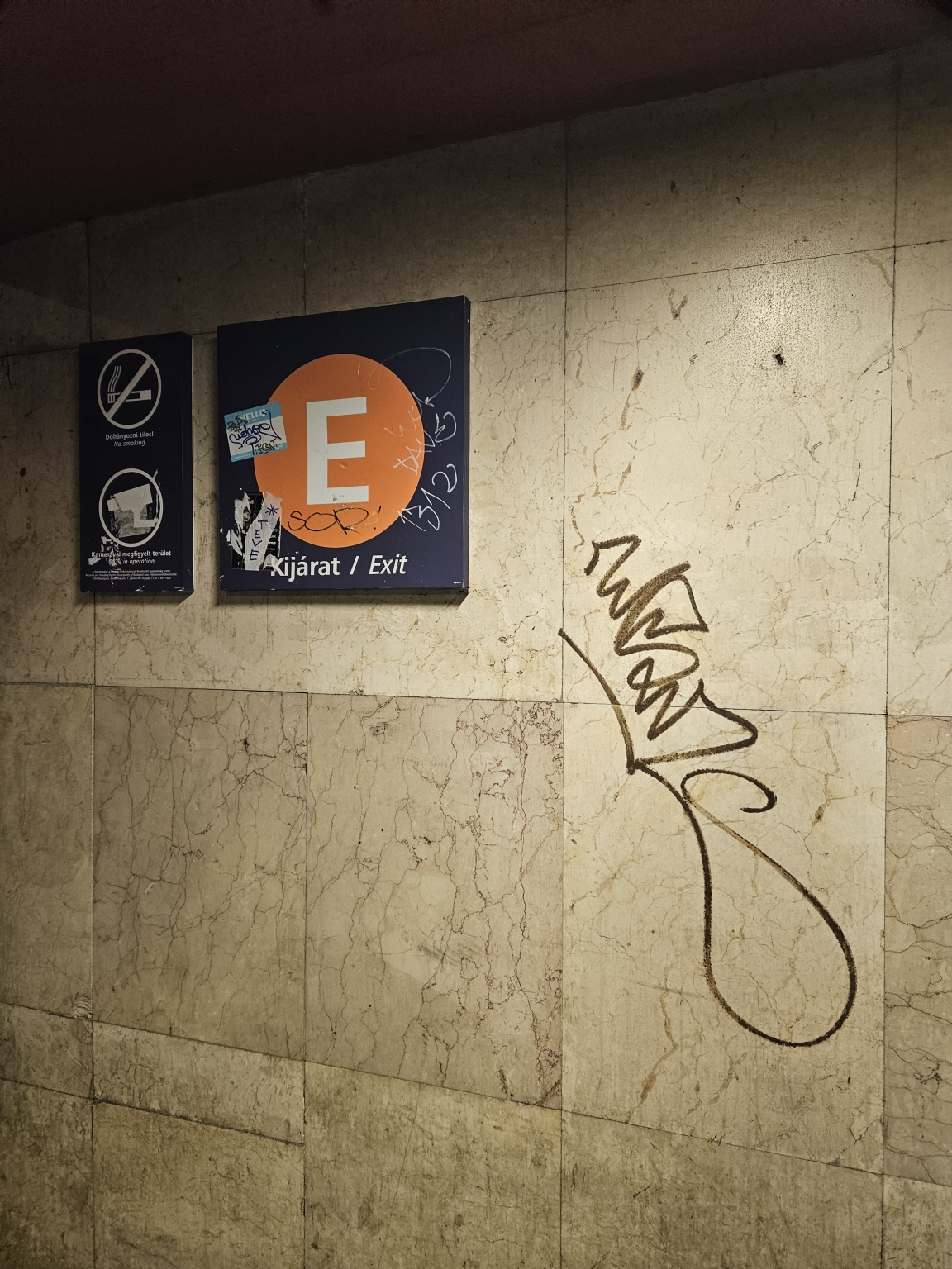 Graffitis és matricás a Boráros téri aluljáró a E lépcsője.