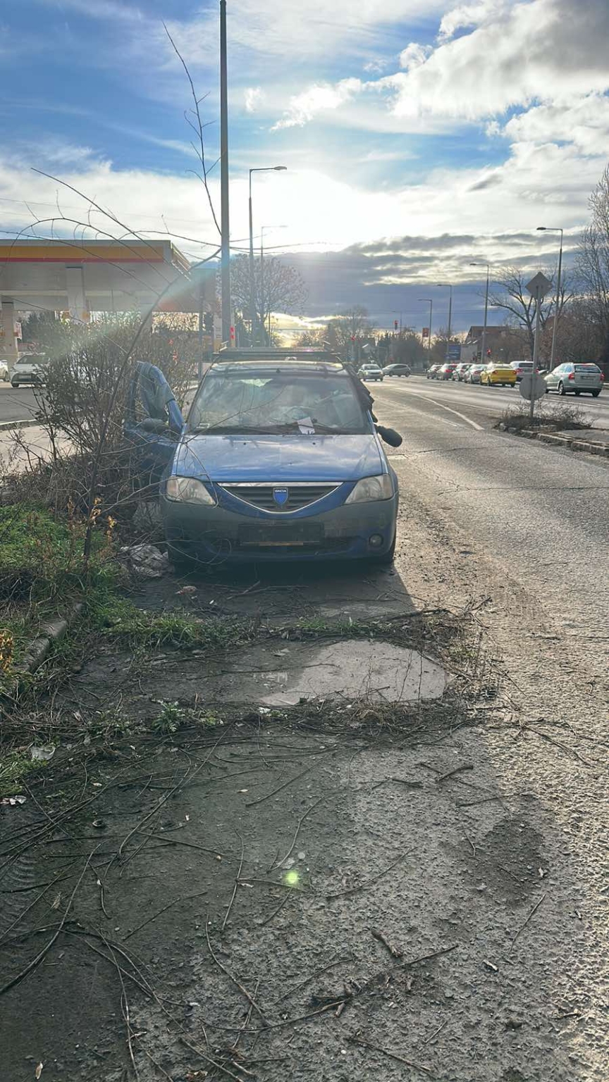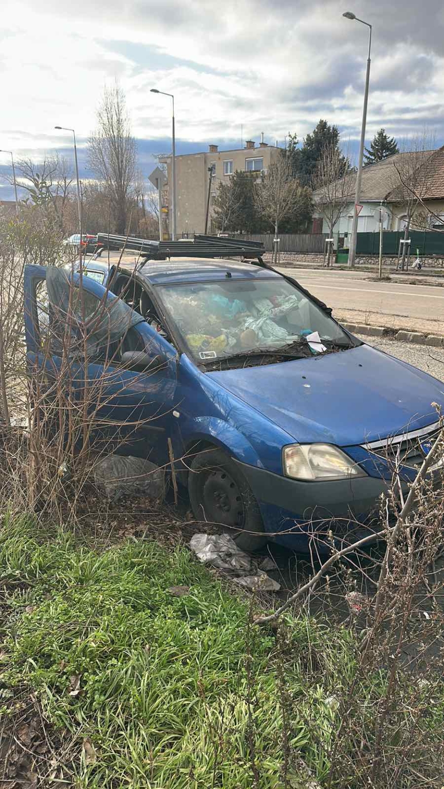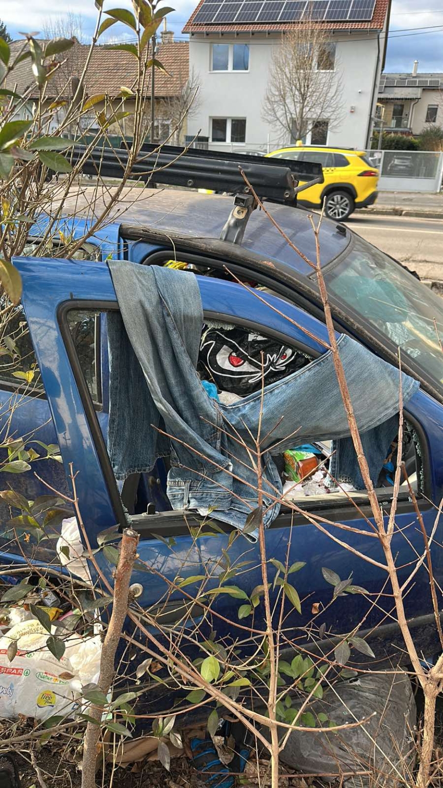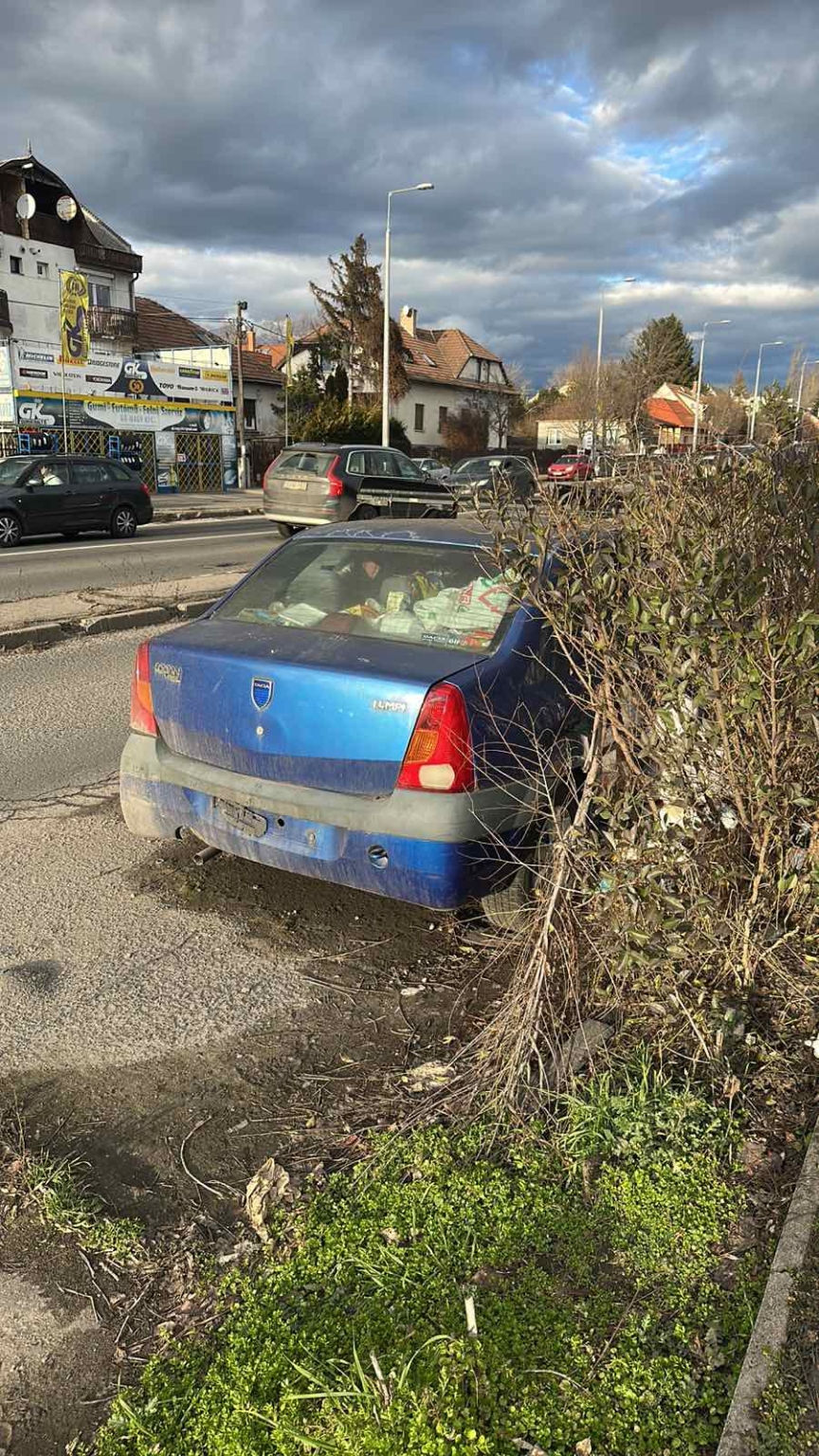 Kék színű elhagyott roncs autó van évek óta lerakva.