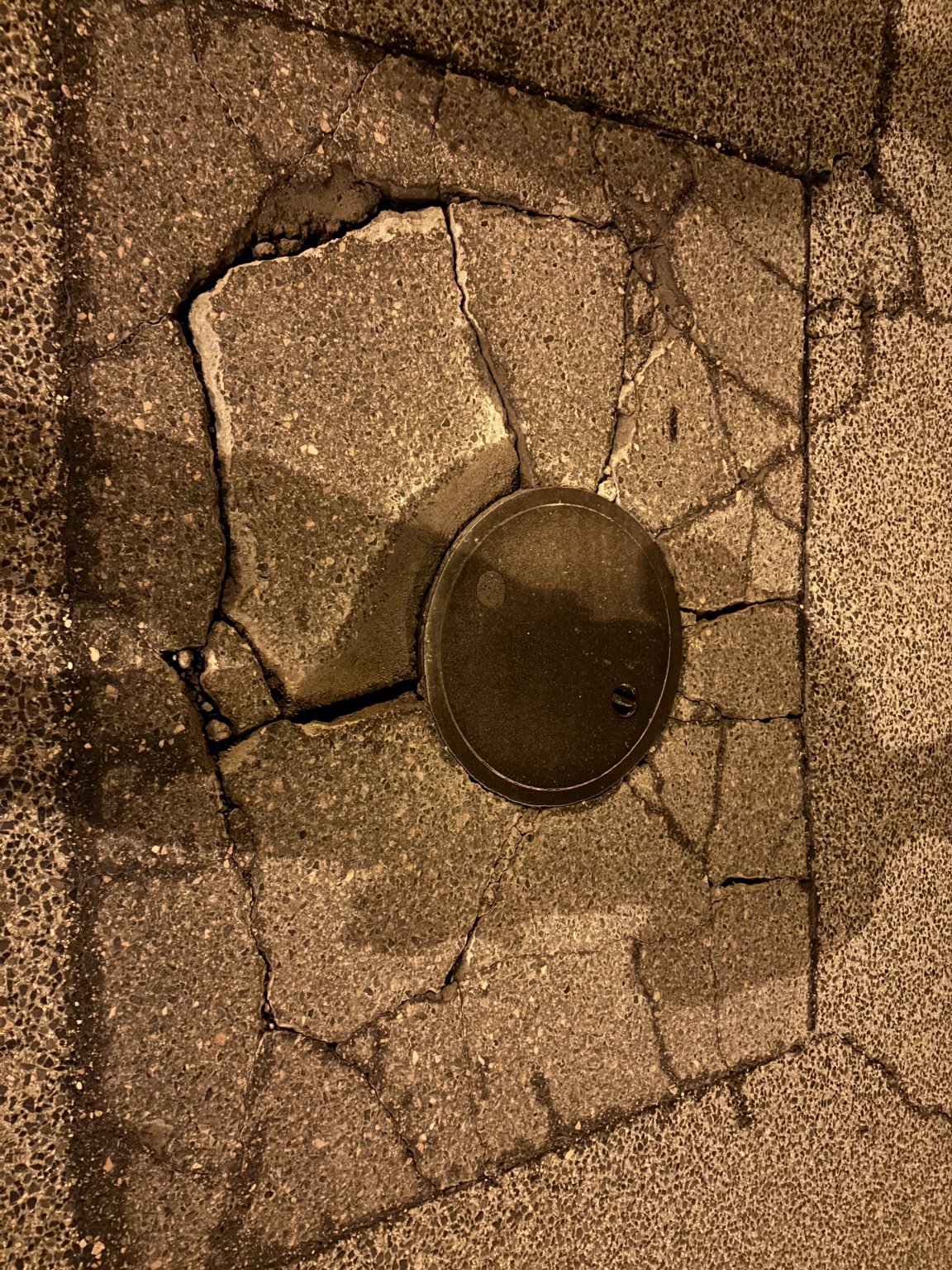 A XIX. kerület Kós Károly tér 1. szám előtt a csatornafedél körül az aszfalt be van szakadva és a darabok mozognak, félő hogy teljesen be fog szakadni.