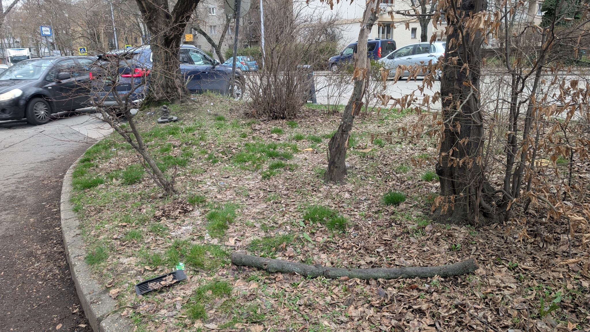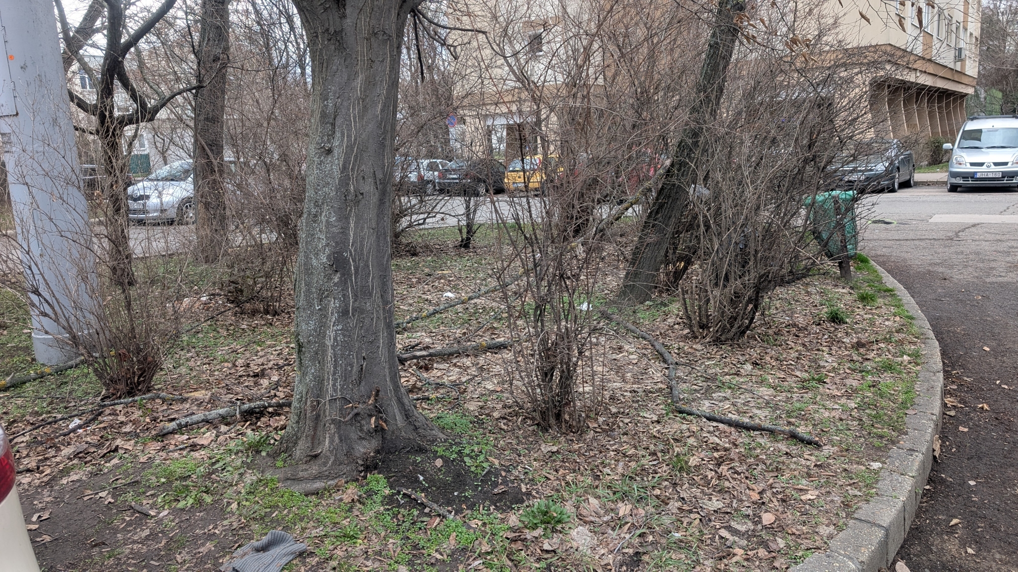 A Váradi utca 17 melletti parkolóban és a ház mögötti fás területen több letört faág várja az elszállítást.