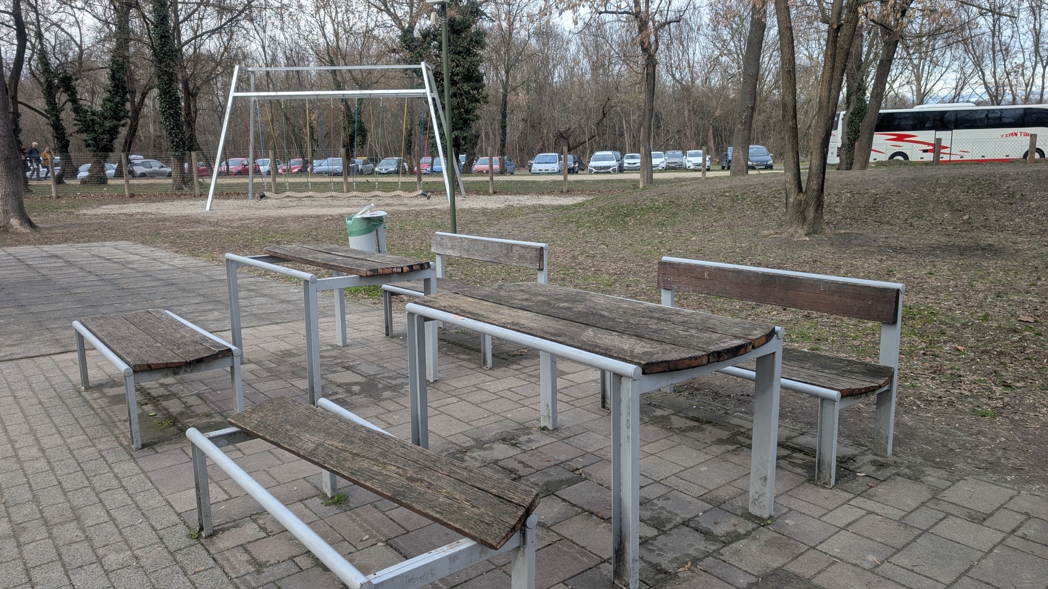 A Rizs Levente sportcsarnok melletti játszótéren javításra szorul egy pad és asztal.