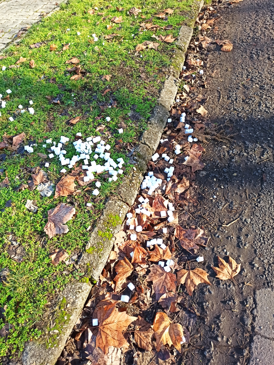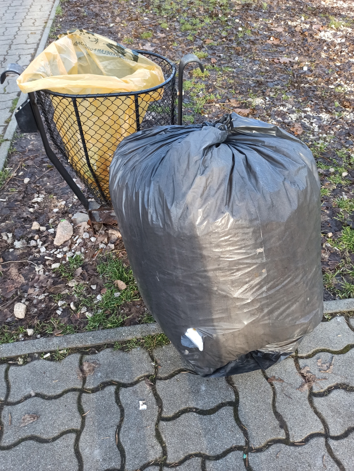 Közterületre kihelyezett illegális hulladék. A zsák kilyukadt és a környék tele van a zsákból kihullott szeméttel.