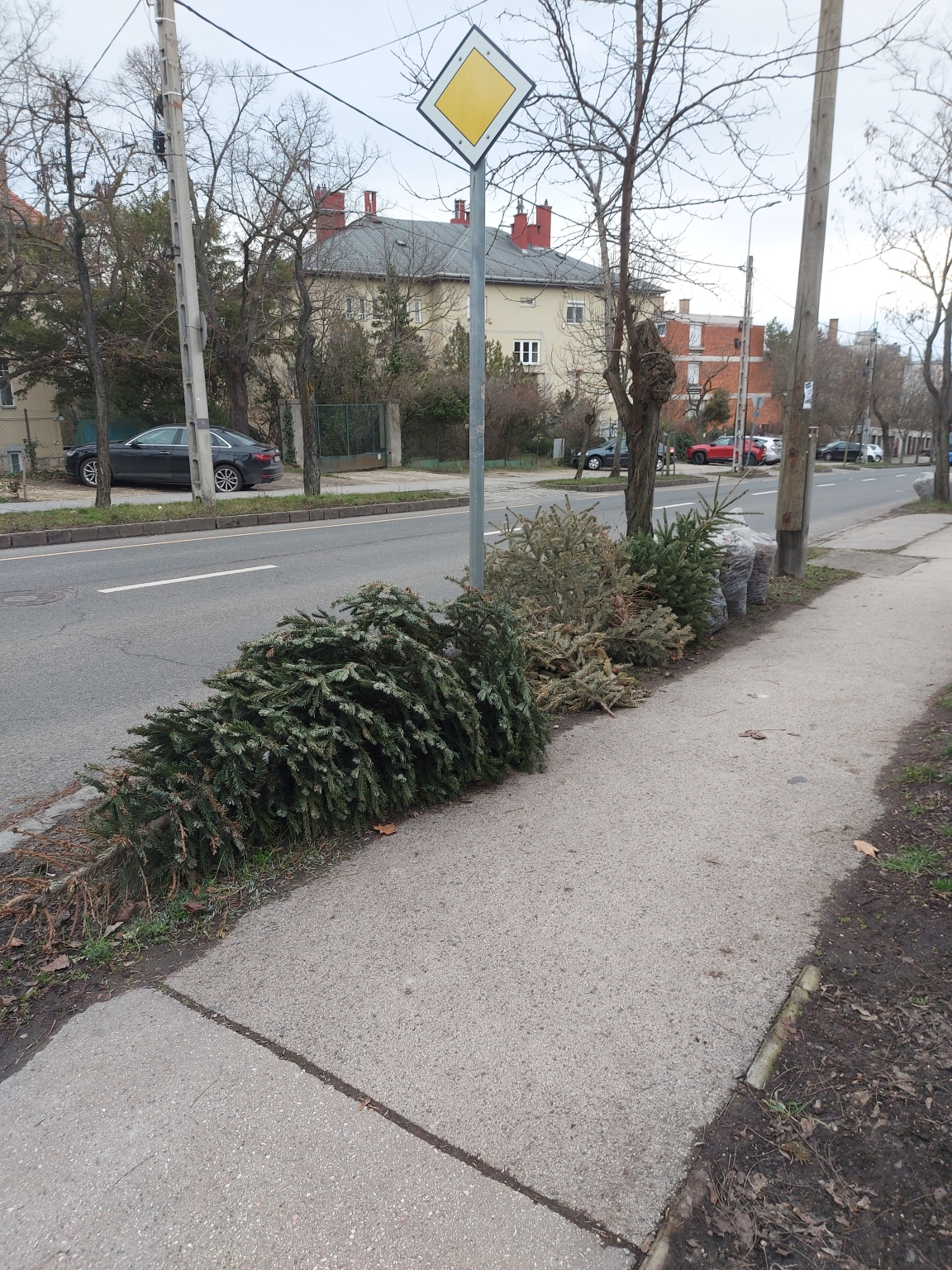A II. kerületben sok helyen nem vitték el a karácsonyfákat. Ezek legalabb 3 hete vergődnek az út mentén.