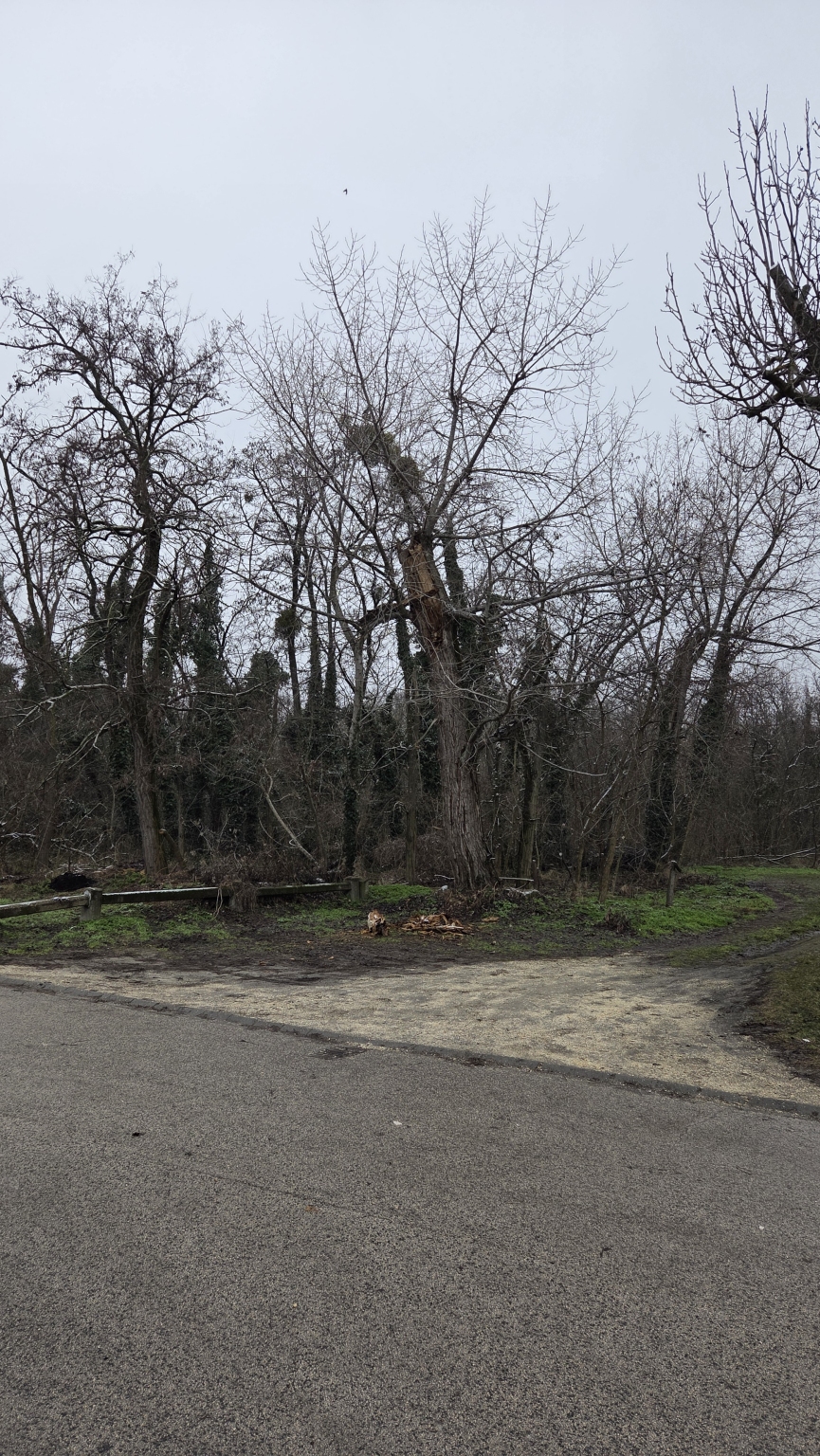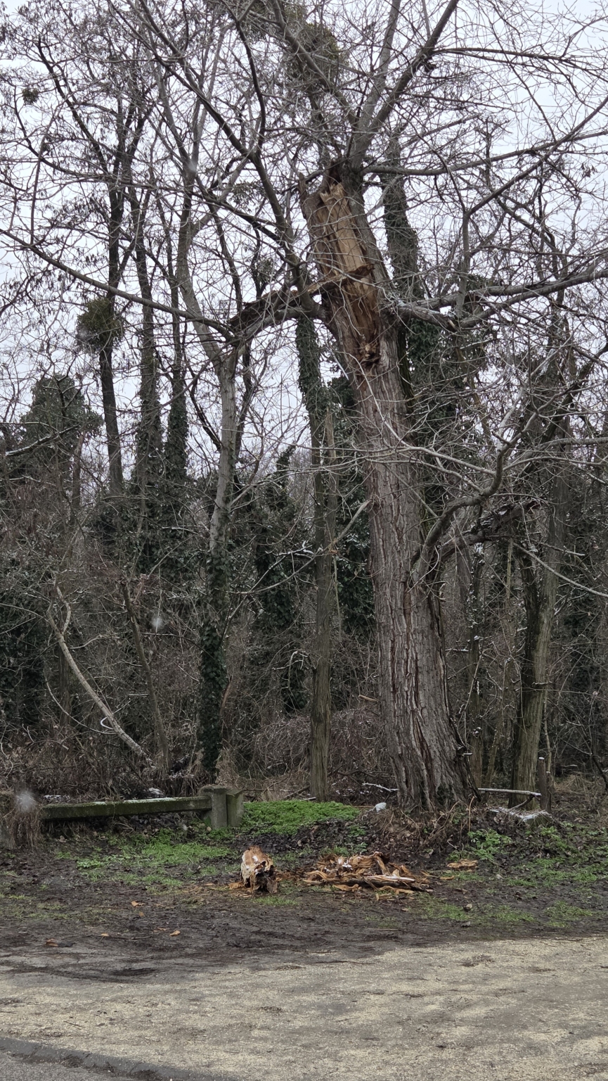 Egy nagy, rossz állapotban lévő fa készül kidőlni a Vezér utca végében a parkoló szélén. Több nagy darabja már le is zuhant.