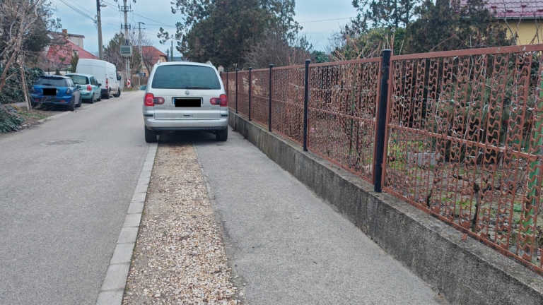 Itt mindig így parkolnak az autók. Oszlopok elhelyezése lenne a megoldás.