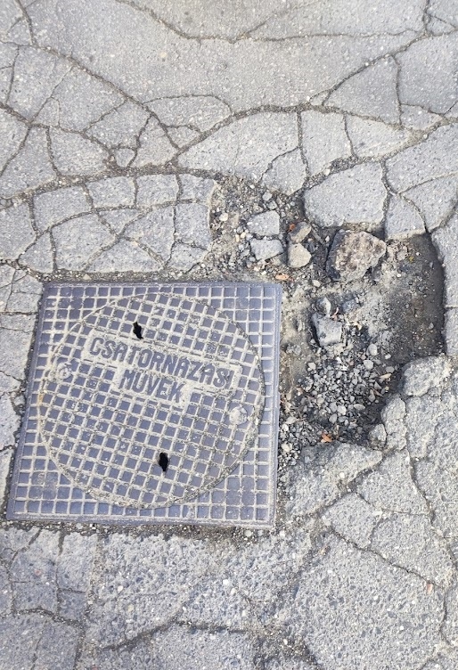 A jelzett címen az úttest közepén található a Csatornázási Művek aknafedele. Közvetlenül emellett van egy nagy kátyú, ami az éles fém perem miatt különösen veszélyes az autók gumijaira.
