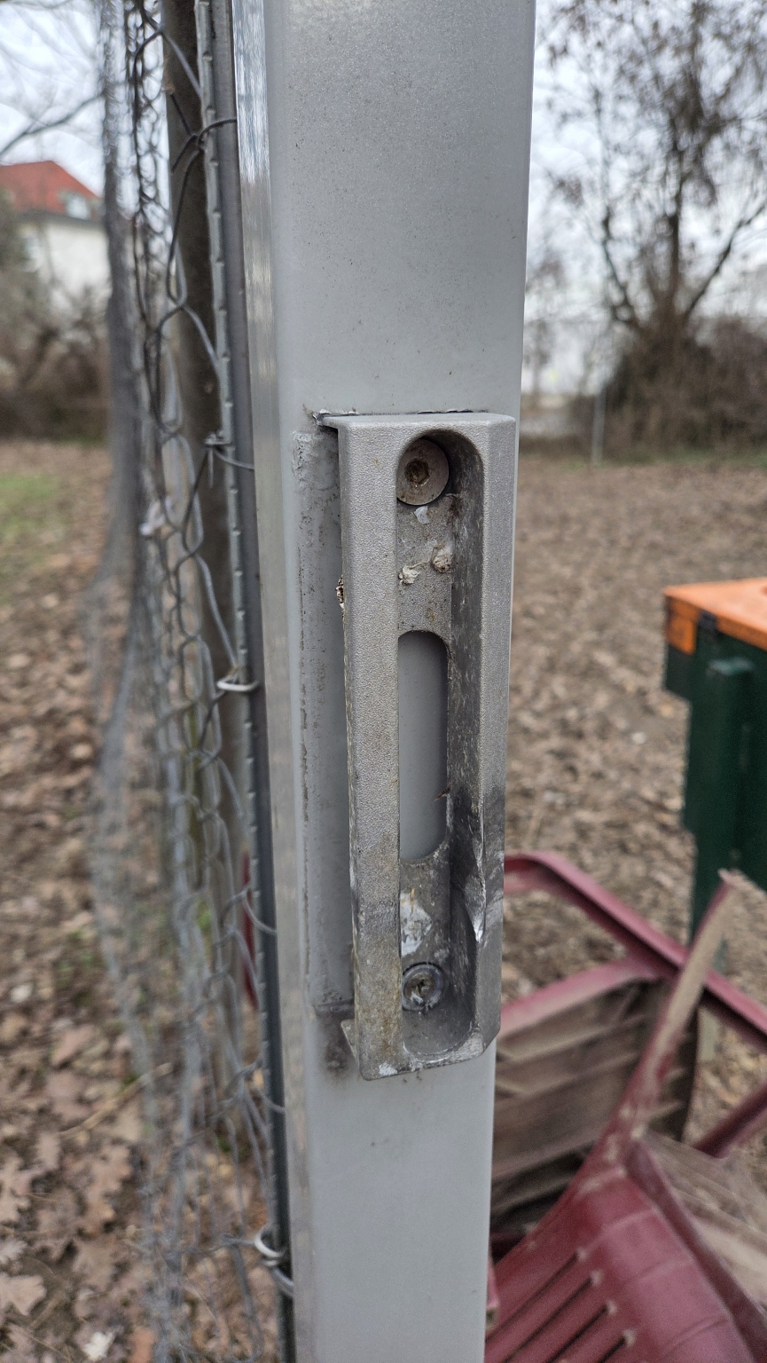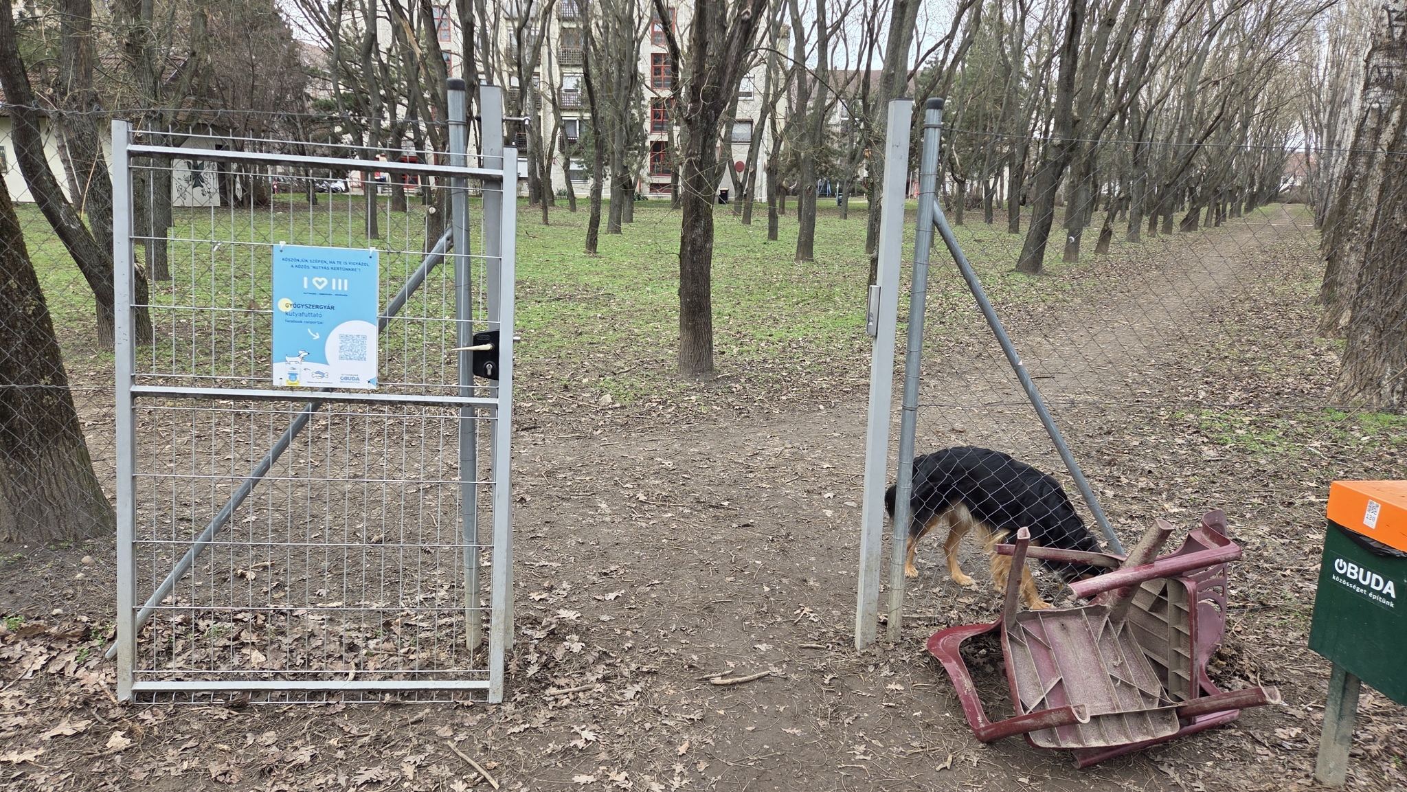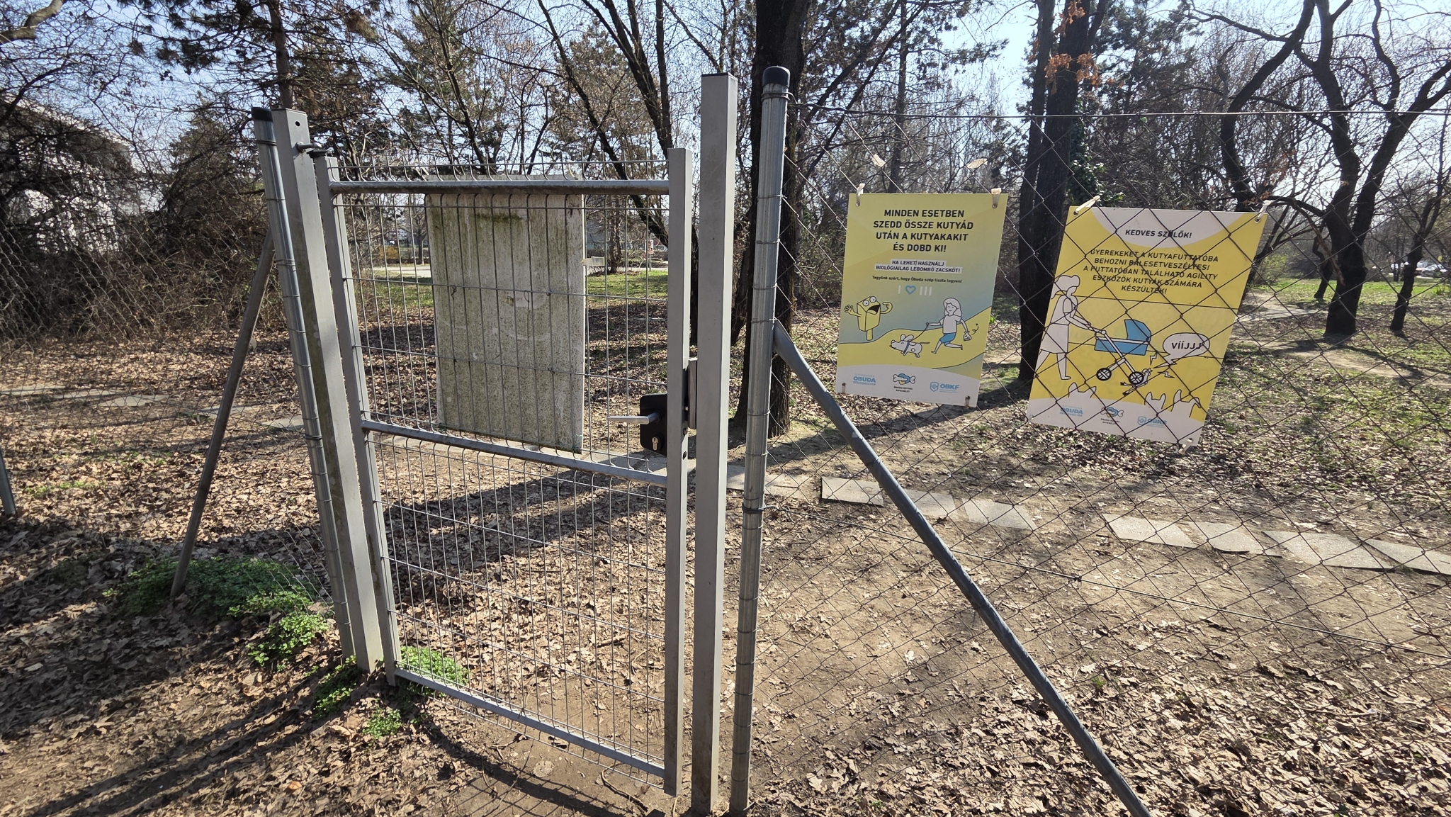 A Gyógyszergyár utcai lakótelep és a Csillaghegyi út között található kutyafuttatónak az egyik ajtaja teljesen kiesett a helyéről, és hiányzik a záródásánál az ütközőlemez (ez már korábban kiesett a helyéről). A másiknak ajtajának a felső pántja nincs rendesen rögzítve.