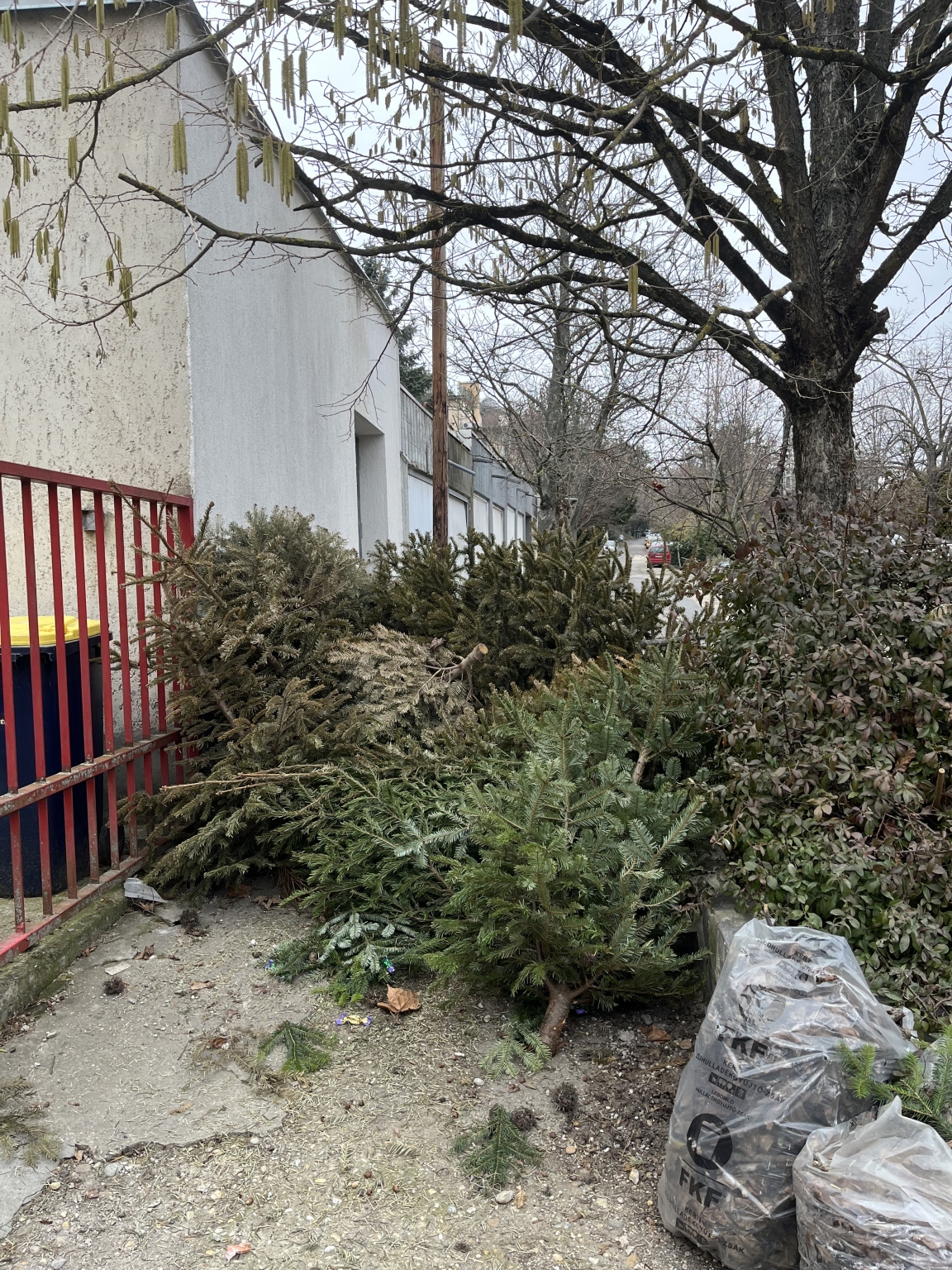 Rőzse utca 6 előtt január óta szomorkodnak a karácsonyfák.